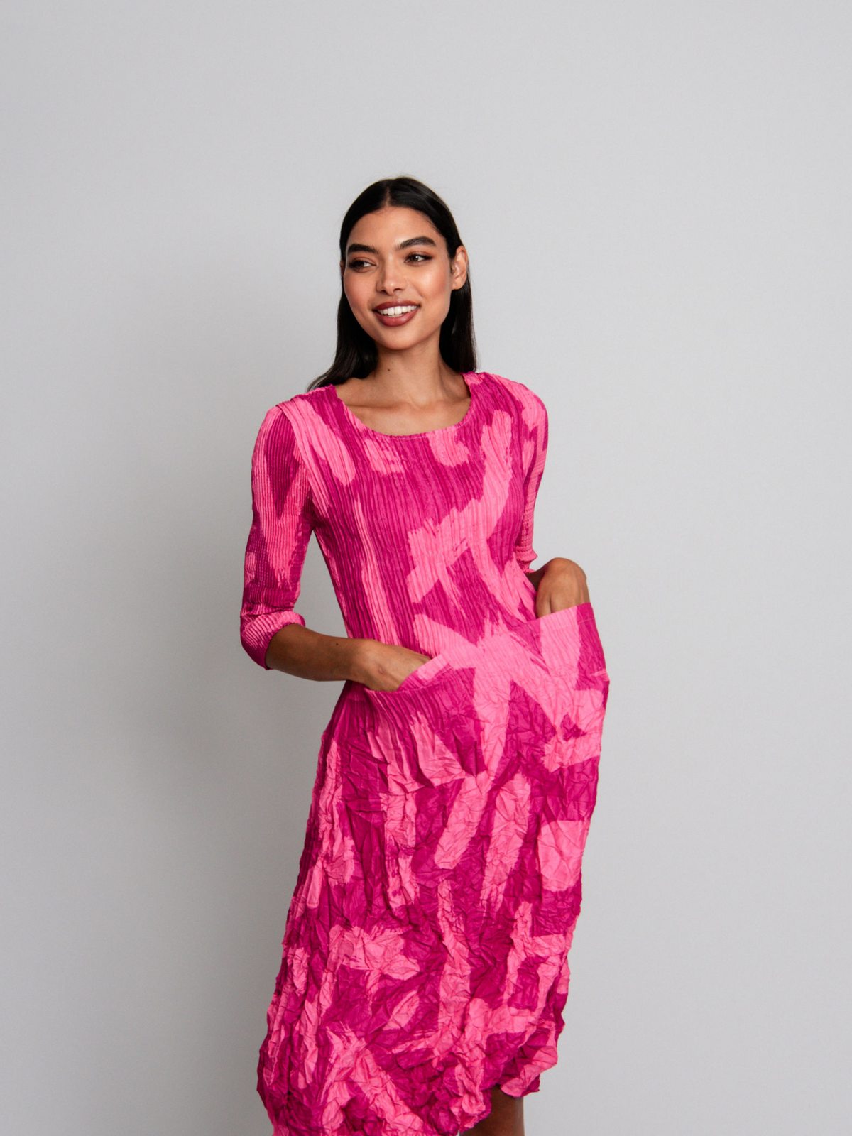 Pack light, look fabulous! The Smash Dress is designed for travel, with crushed pleats that always look chic. These unique pleats mean no ironing, just pack, unpack, and go.