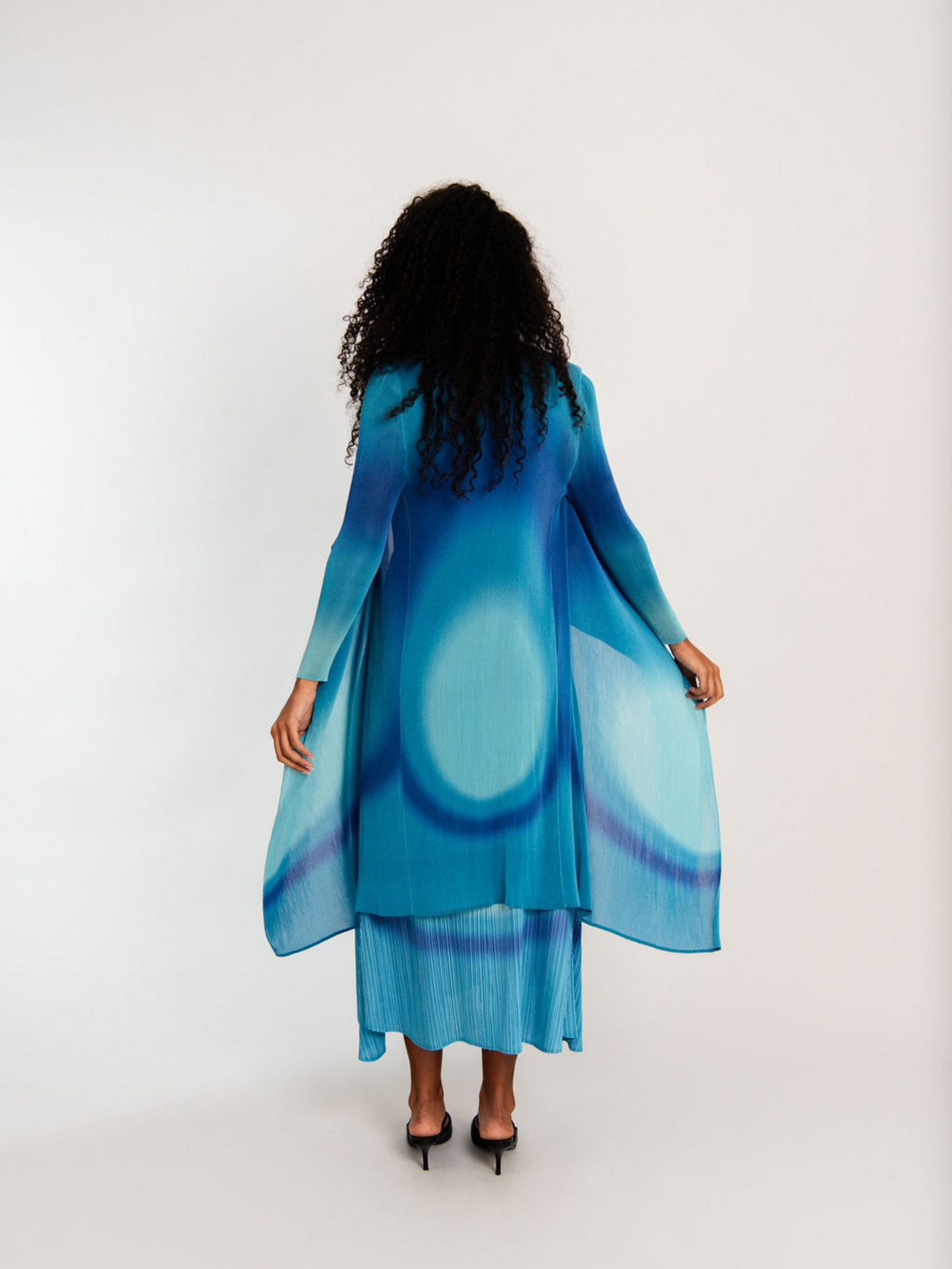 A signature Alquema silhouette, the Collare Coat in Ombre is a timeless expression of colour, movement, and craftsmanship. Crafted from 100% chiffon, this lightweight, slightly sheer layer features a cascading waterfall collar, long sleeves, and a midi-length hemline. The pleated design brings sculptural texture and graceful fluidity, while the ombré dye technique creates a seamless wash of shifting tones. Stylish yet versatile, it’s a striking companion to dresses or separates, perfect for layering with poise and ease.
