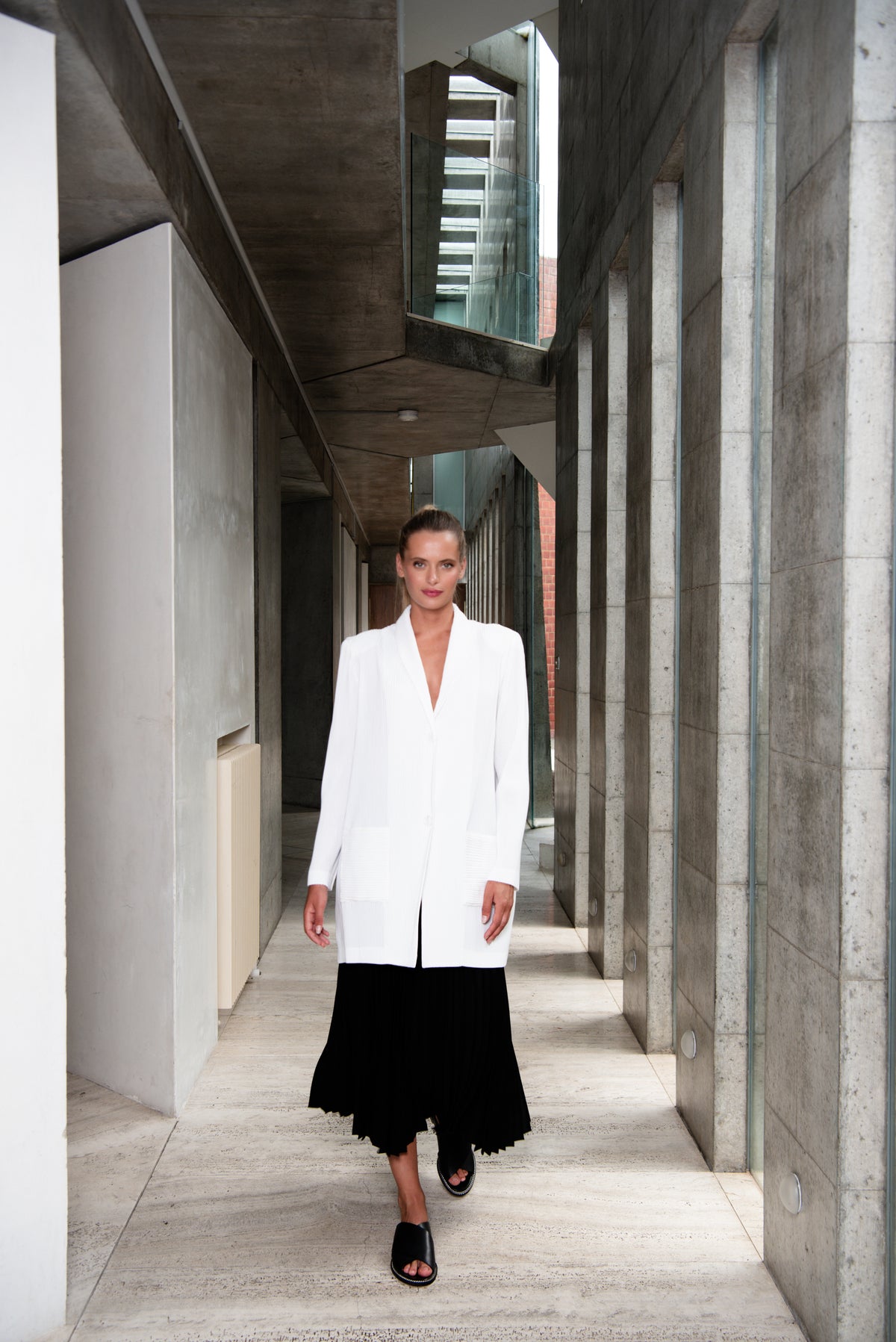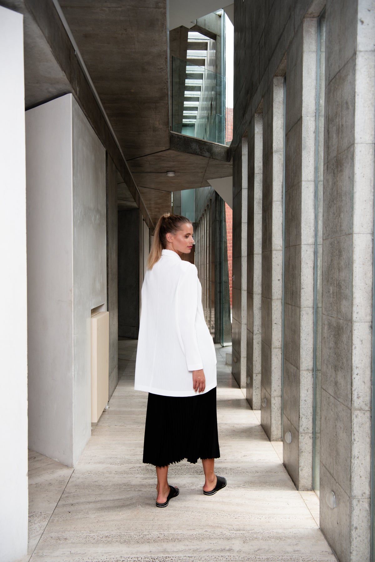 Stylish and seductive, our Plisse Blazer takes your everyday blazer to a whole new level. The vertical pleats throughout, including the collar beautifully contrast with the horizontal pleating of the pockets, adding depth and flavour.