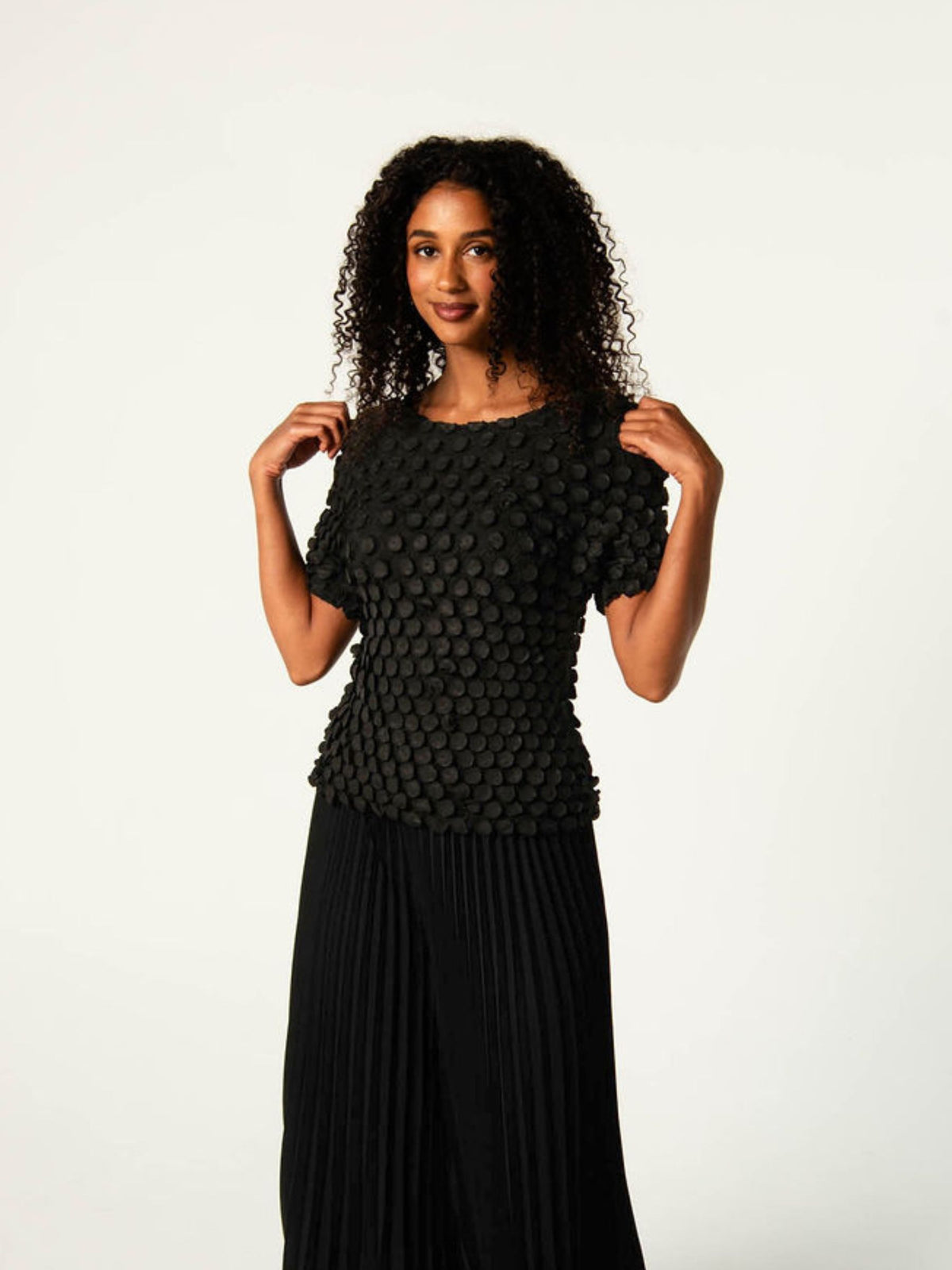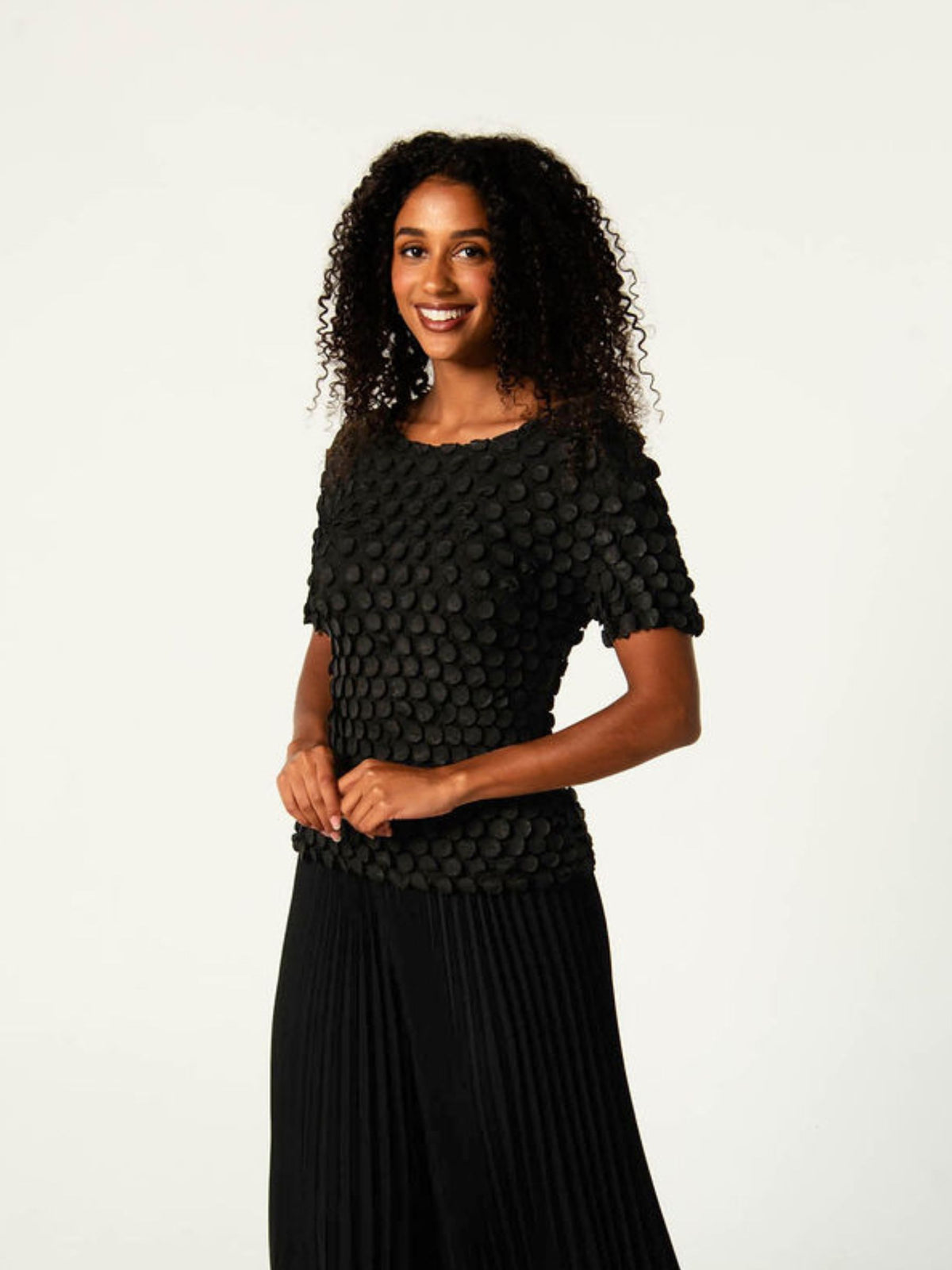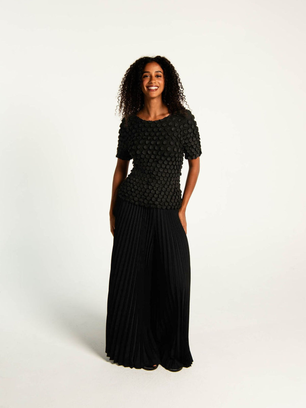 The Bubble Top is a statement piece defined by texture. Crafted in Alquema’s distinctive pleating, in a new circular pressed pleat. This luxe top is finished with hundreds of small, coin-like bubbles that create dimension and movement from every angle.