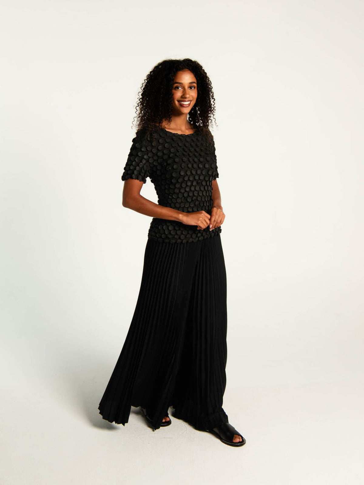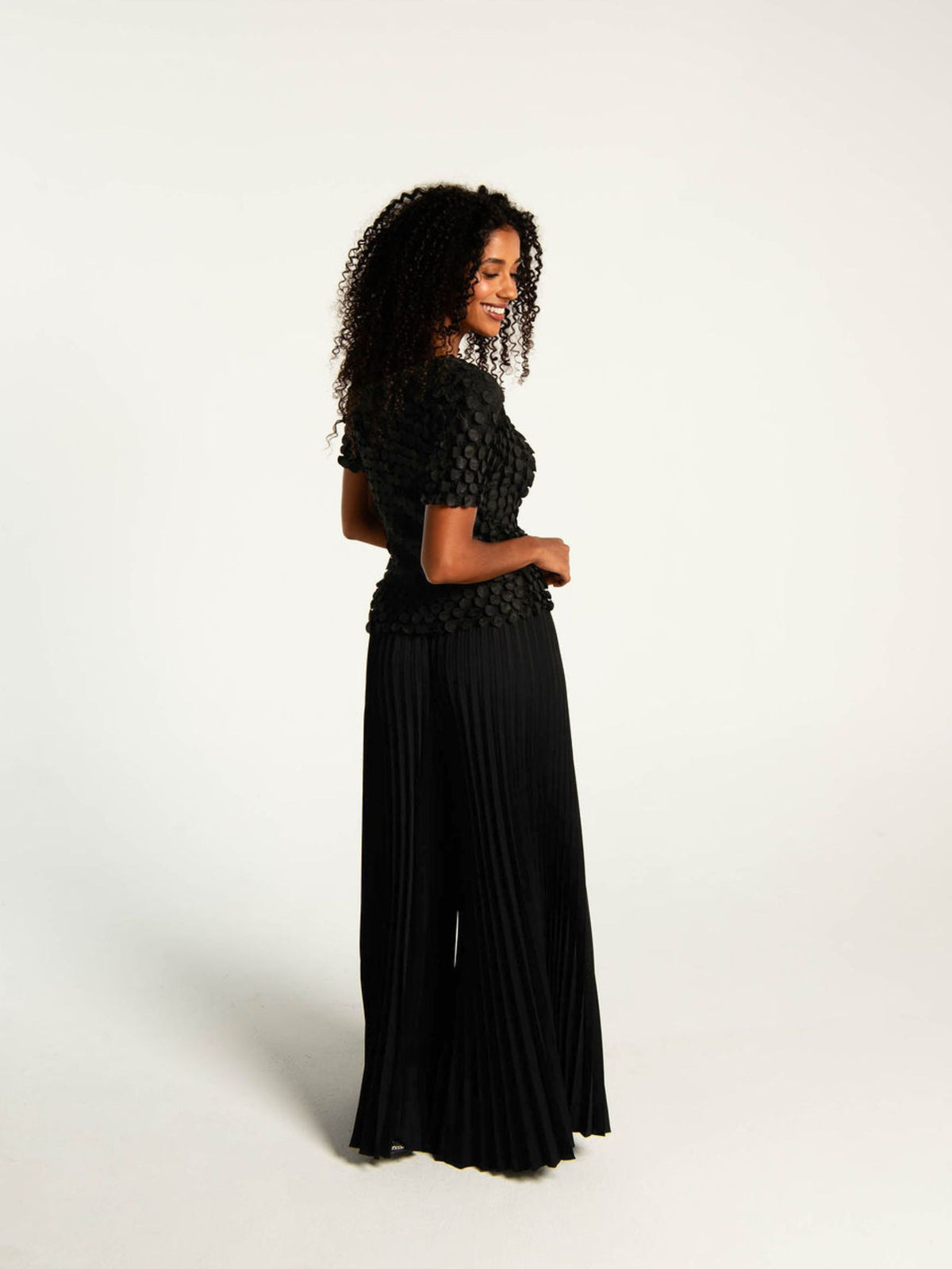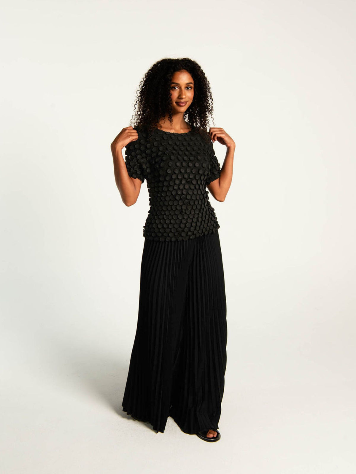 The Bubble Top is a statement piece defined by texture. Crafted in Alquema’s distinctive pleating, in a new circular pressed pleat. This luxe top is finished with hundreds of small, coin-like bubbles that create dimension and movement from every angle.