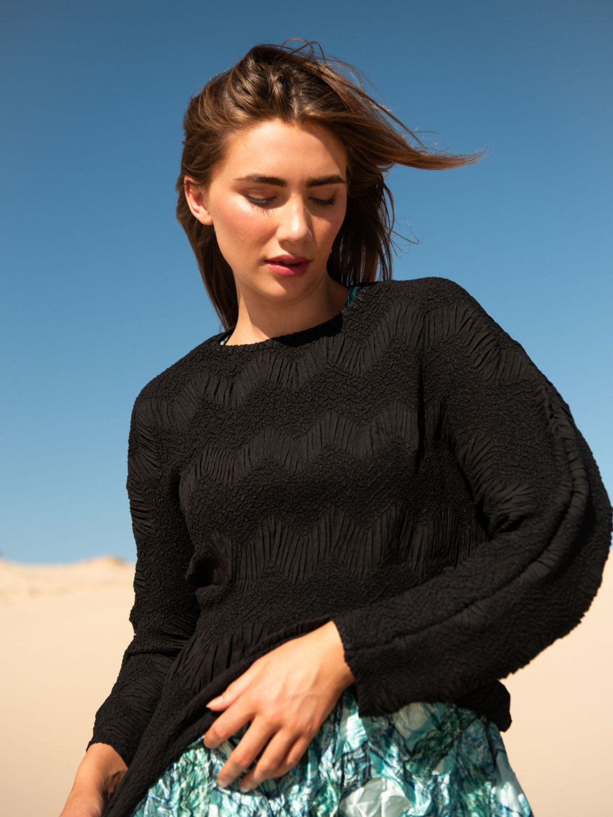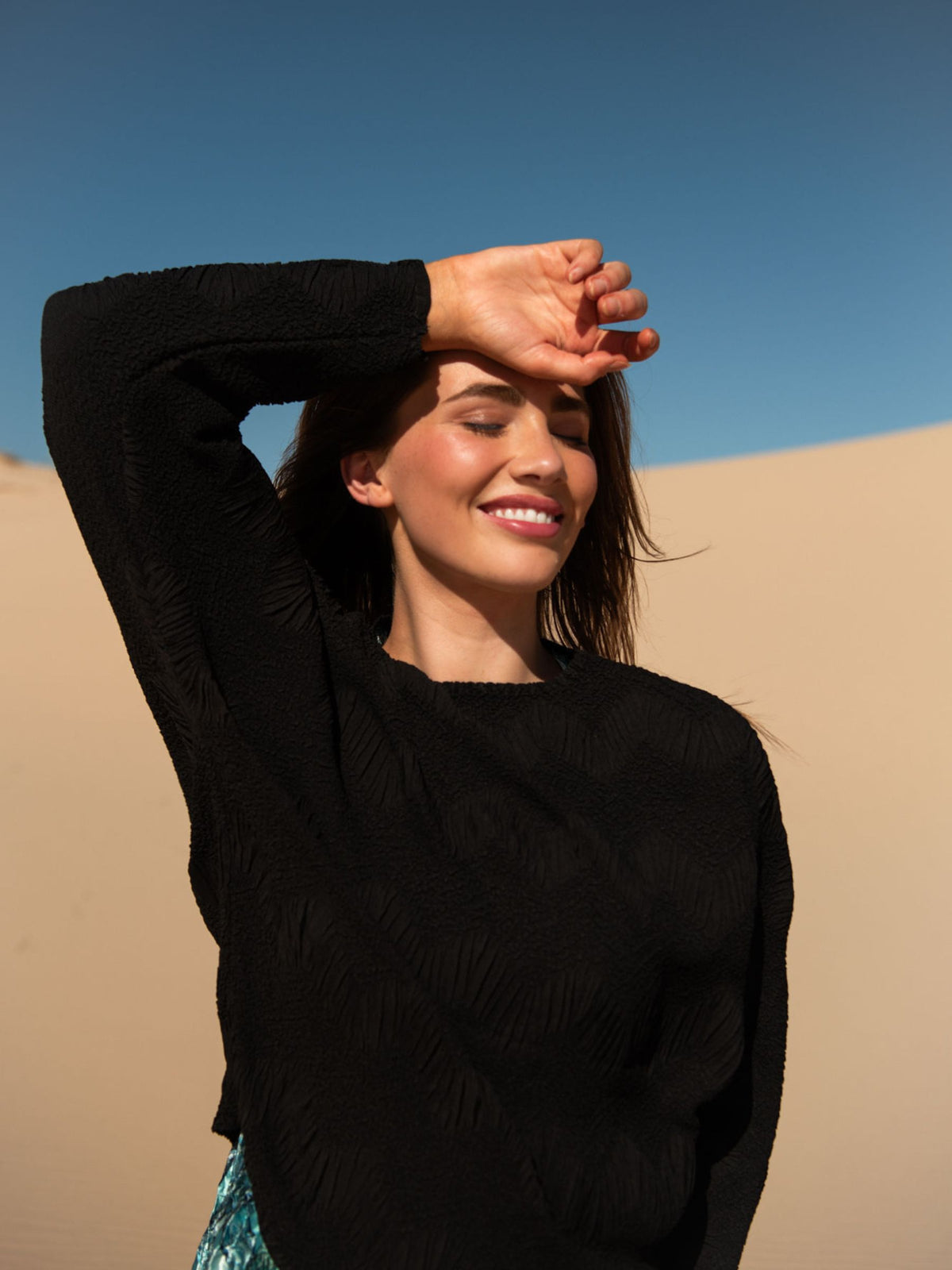 The Cion Top is a modern Alquema essential, designed to bring texture and depth to everyday dressing. Crafted with a richly structured surface, it creates a sculptural finish that subtly catches the light.