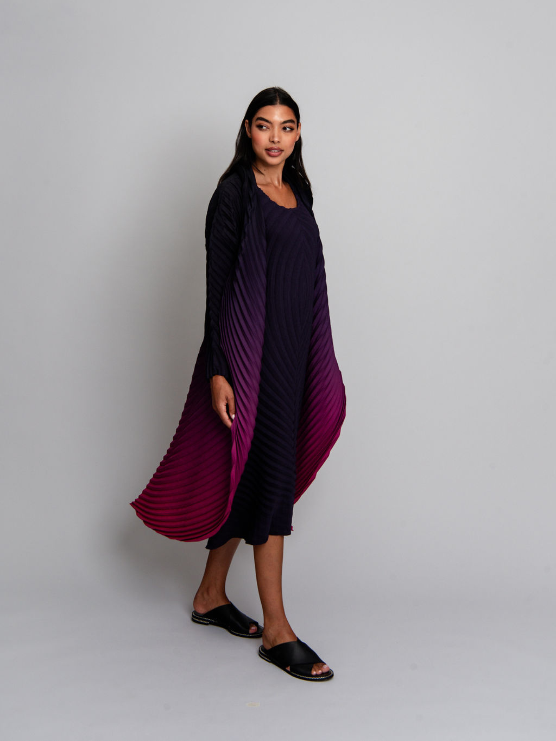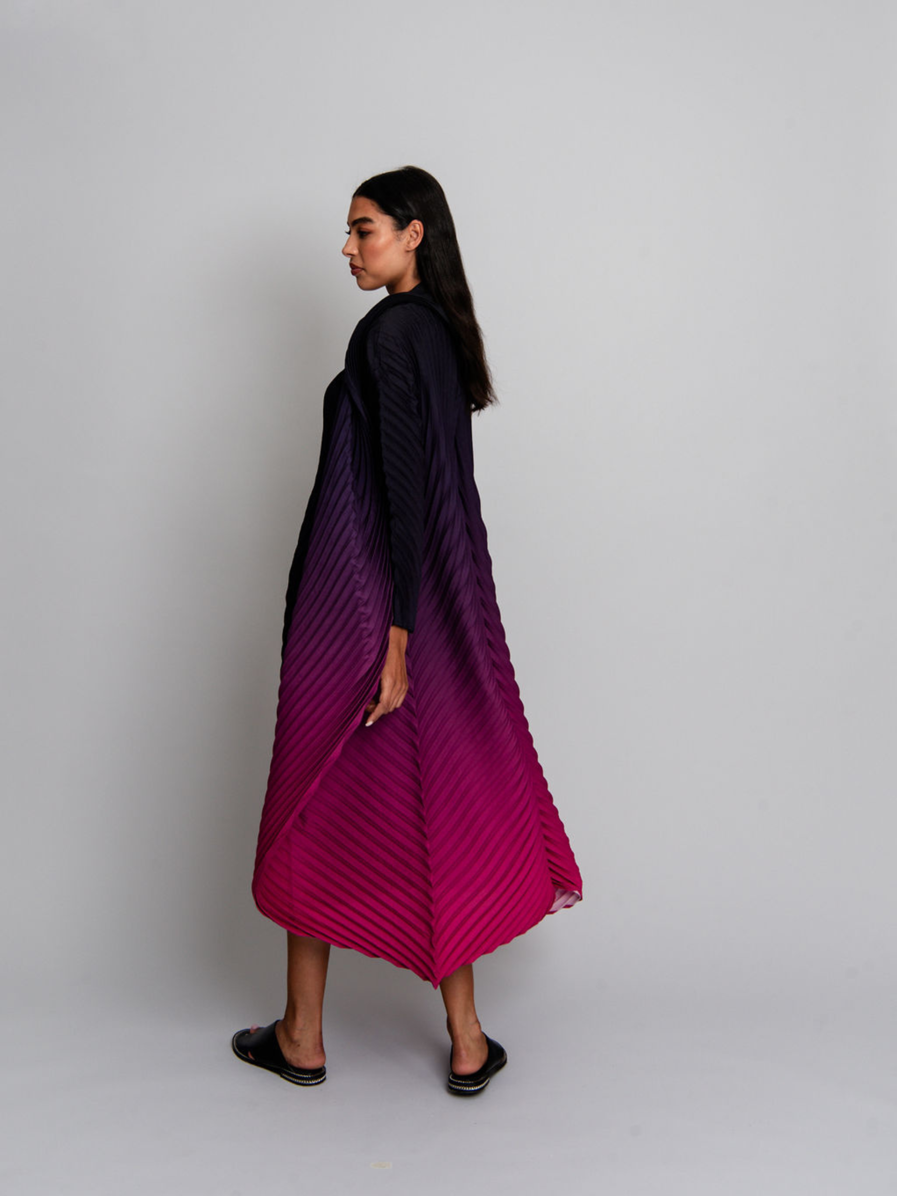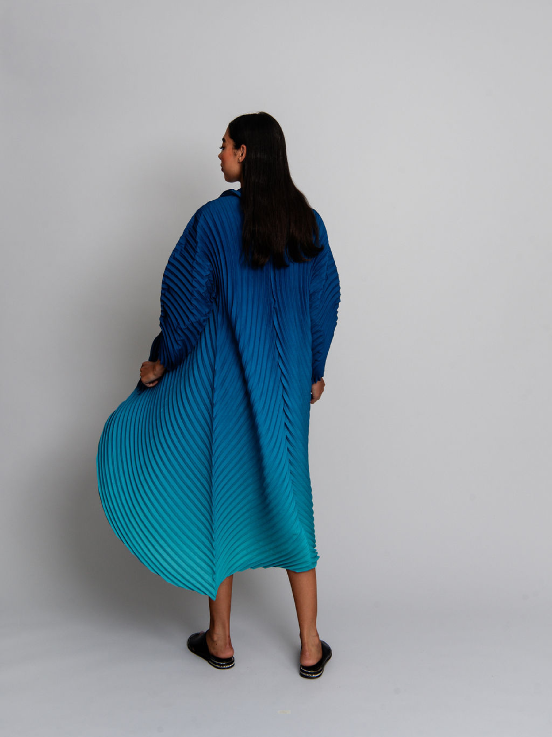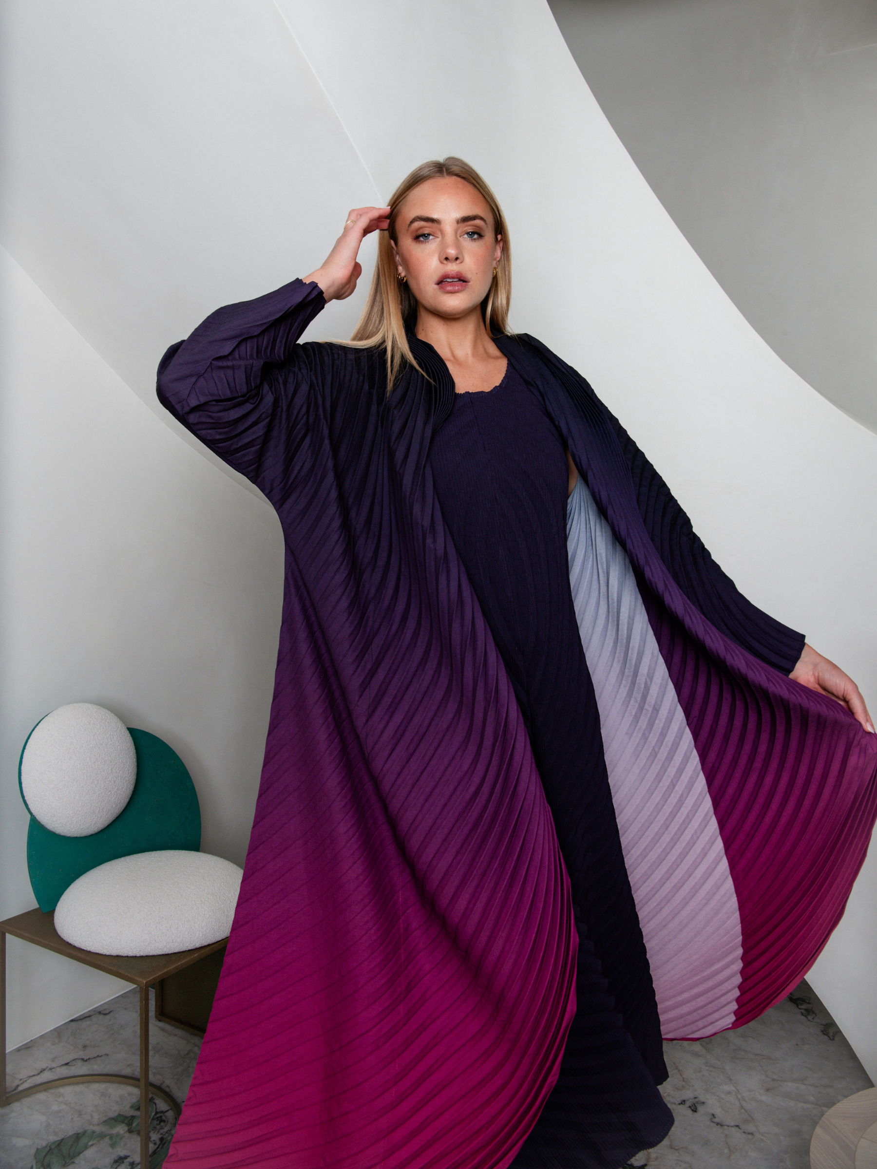 The Classico Coat combines bold pleats with a swirling ombre design, creating a dynamic, feminine silhouette. Its structured collar and flowing lines add drama and elegance, making it an essential layering piece for elevated, artistic styling.