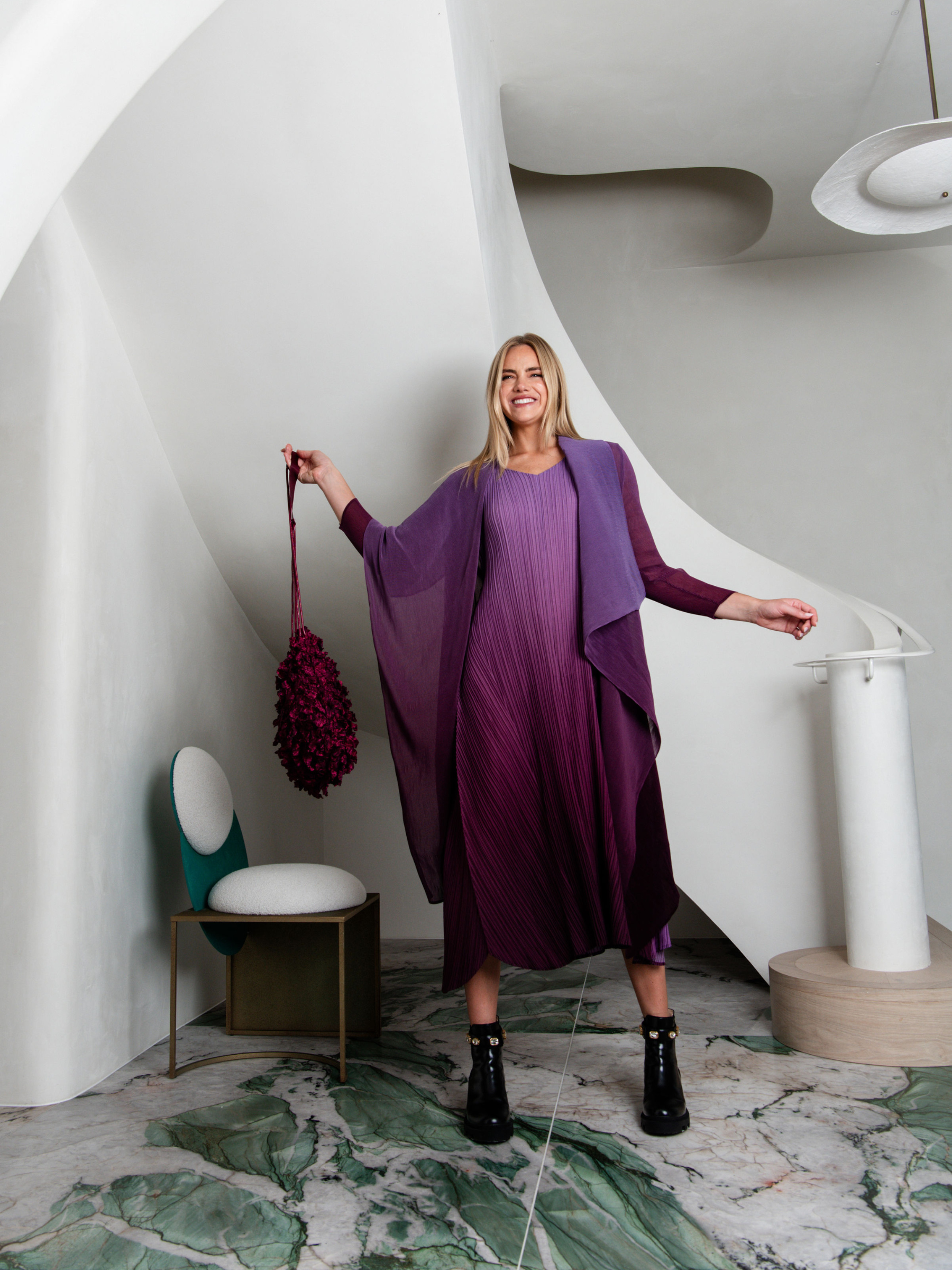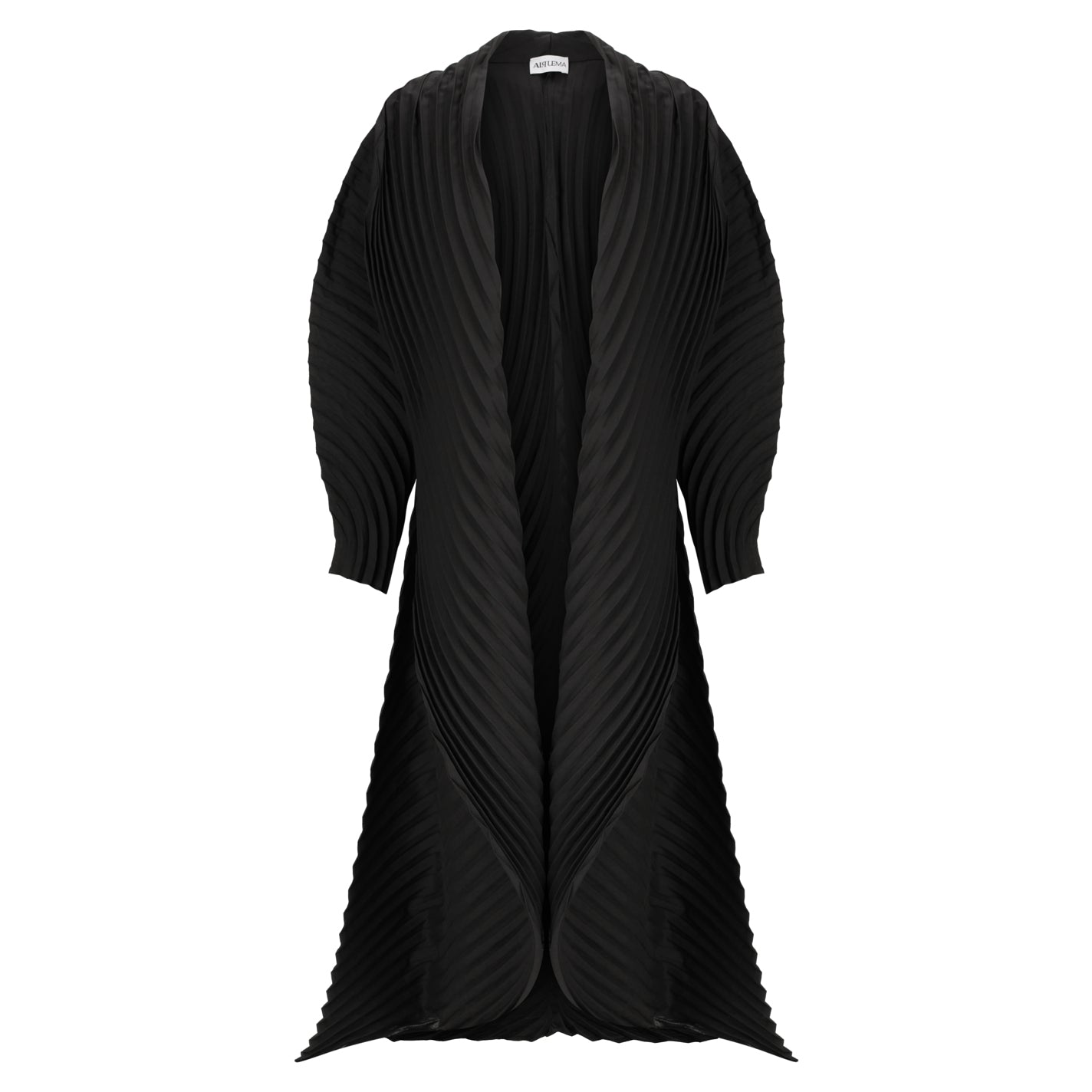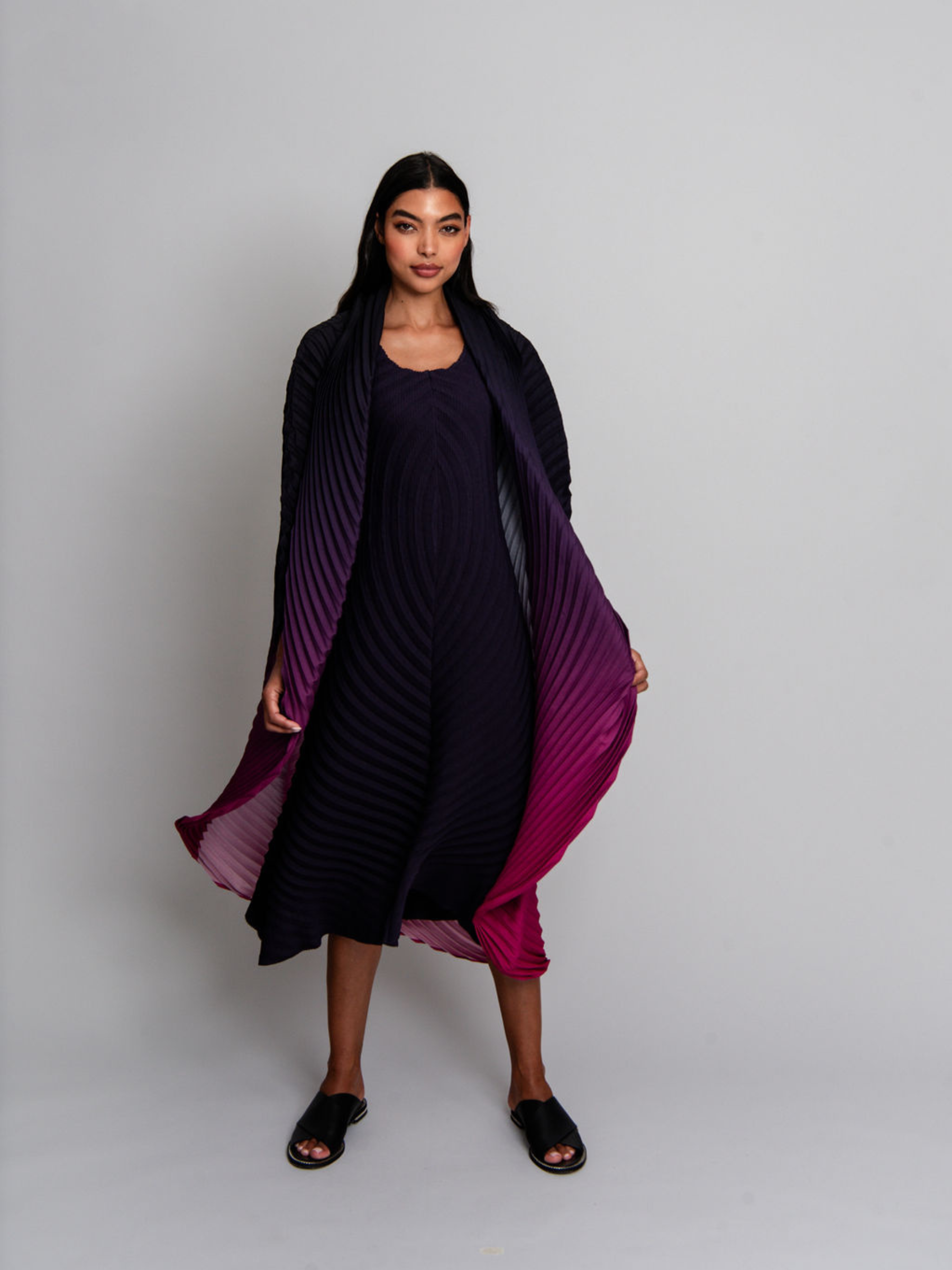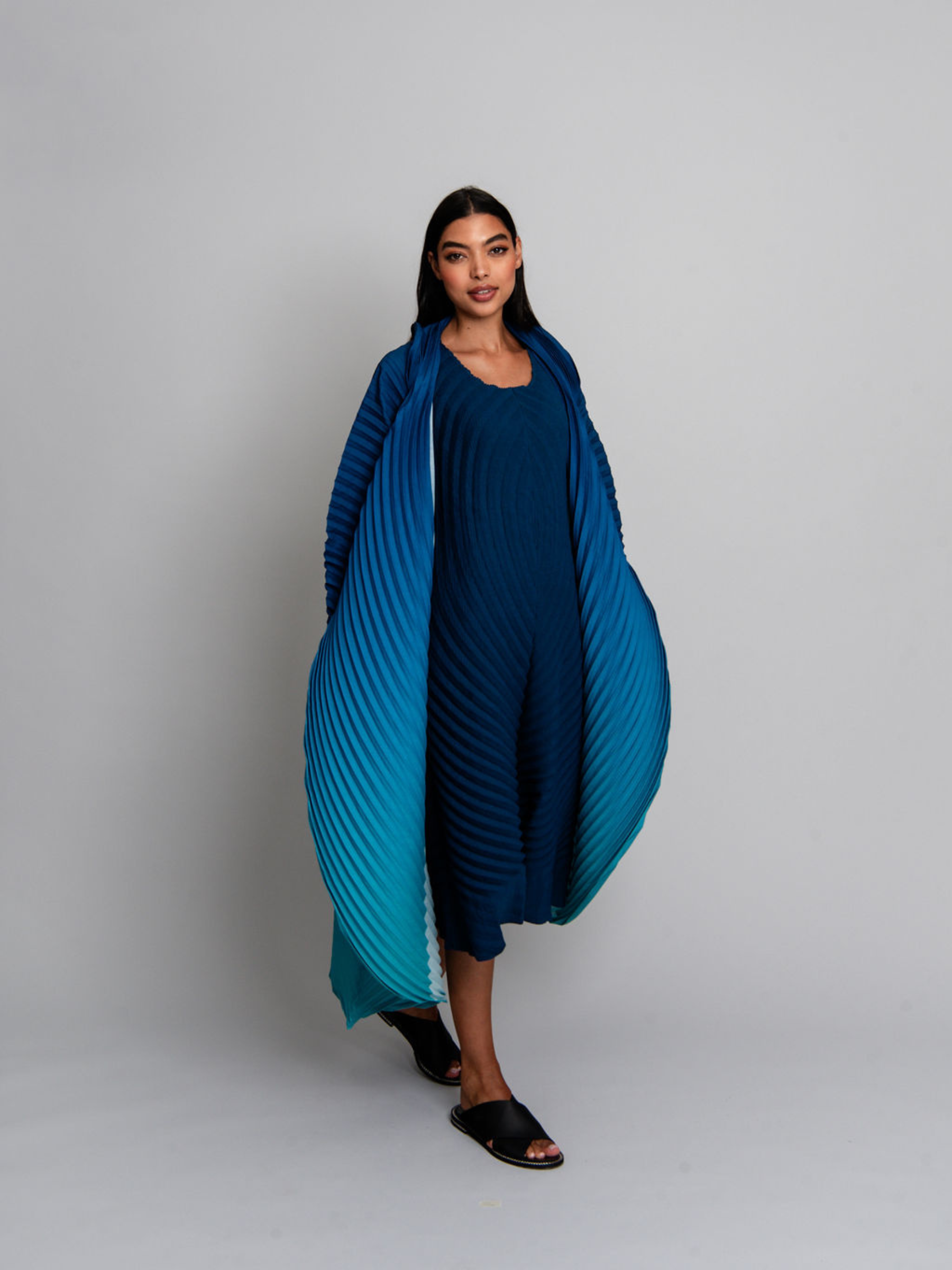 The Classico Coat combines bold pleats with a swirling ombre design, creating a dynamic, feminine silhouette. Its structured collar and flowing lines add drama and elegance, making it an essential layering piece for elevated, artistic styling.
