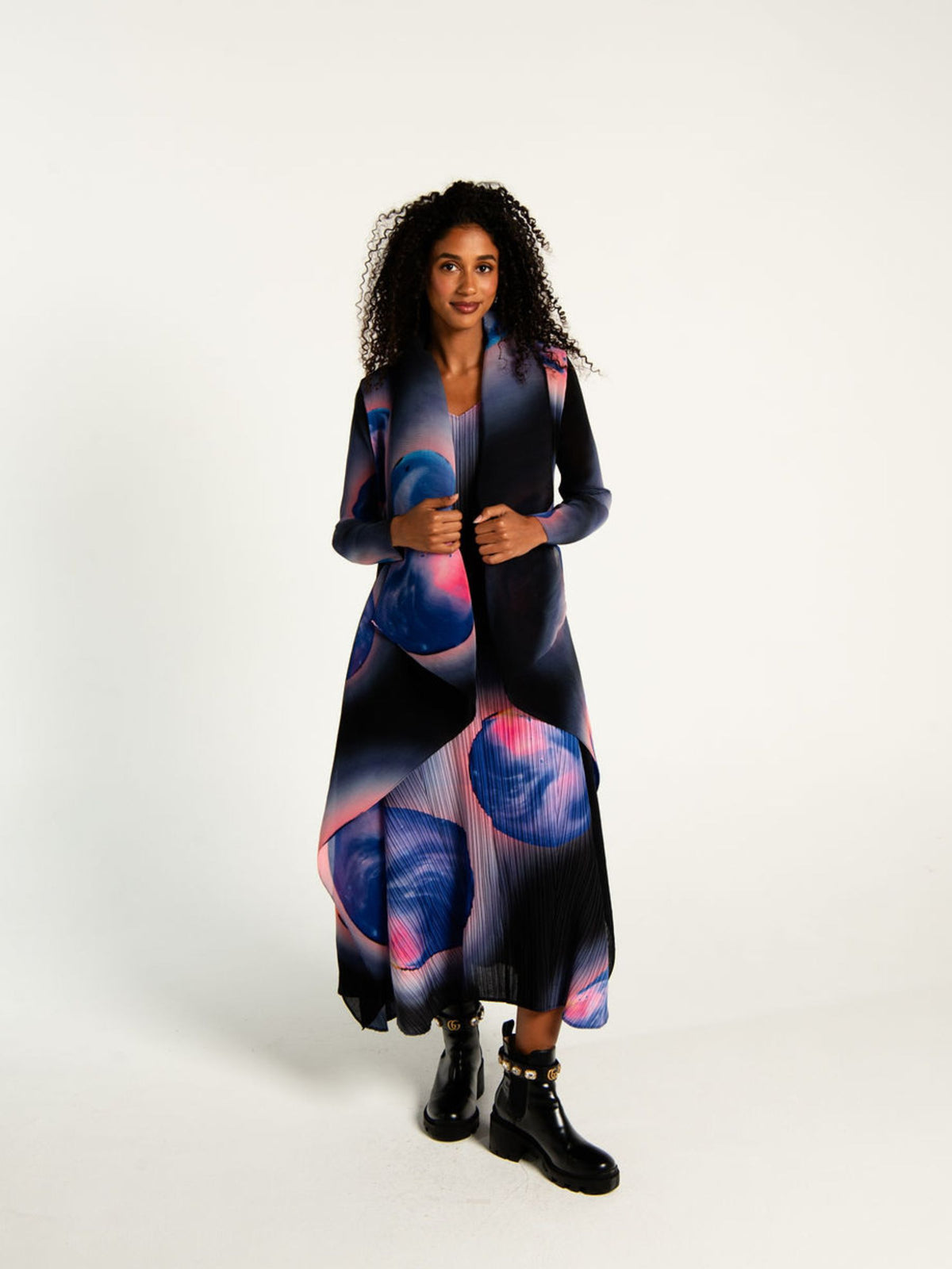 The Collare Coat in print is an iconic layering piece reimagined with bold artistry. Made from 100% chiffon, it’s delicately sheer, midi in length, and finished with long sleeves and a signature waterfall collar. Hand pleated for texture and form, it moves effortlessly with the body, bringing flow and dimension to every look. The printed design adds vibrancy and individuality, making this coat a statement piece that elevates everyday or event dressing.