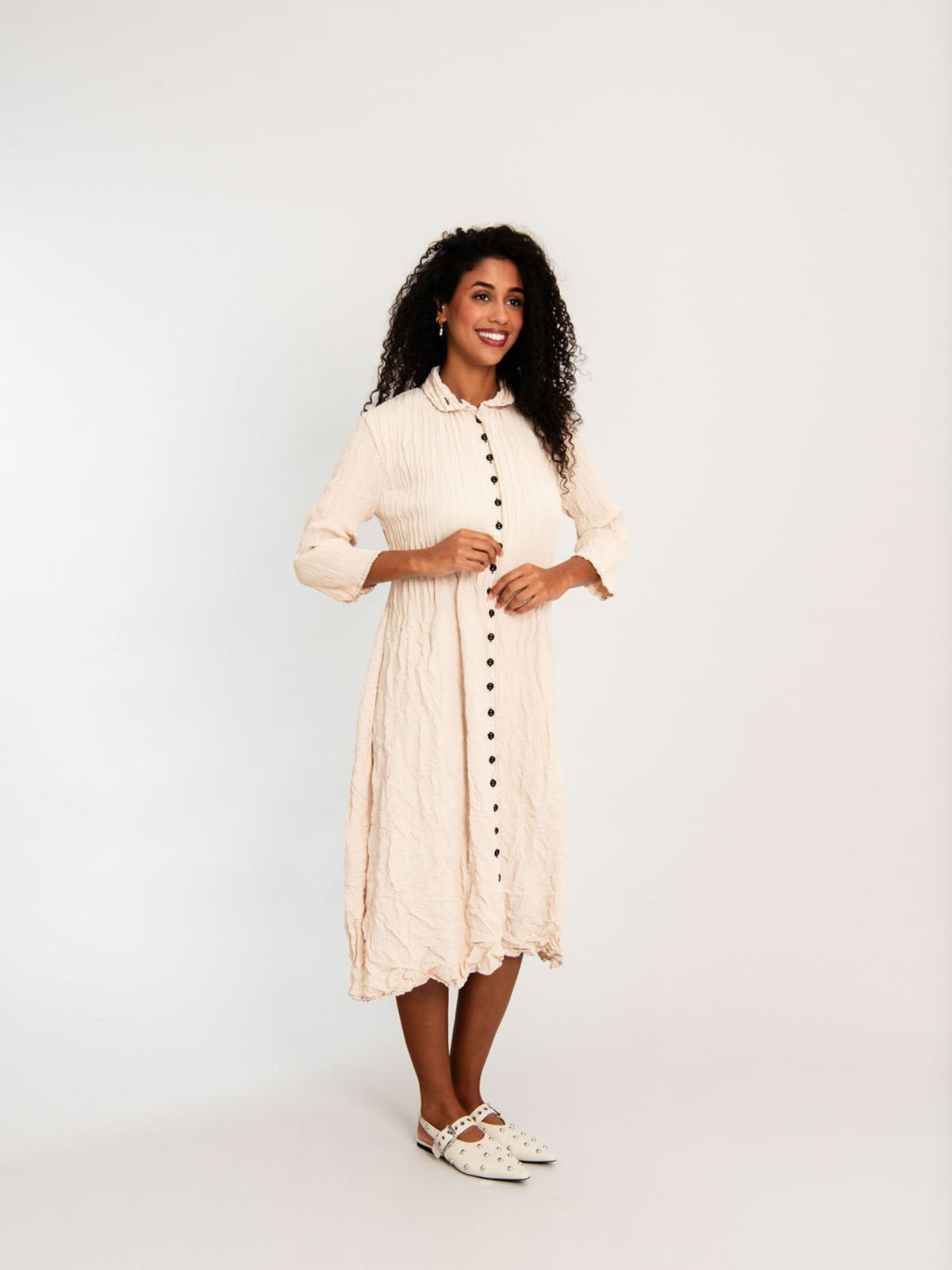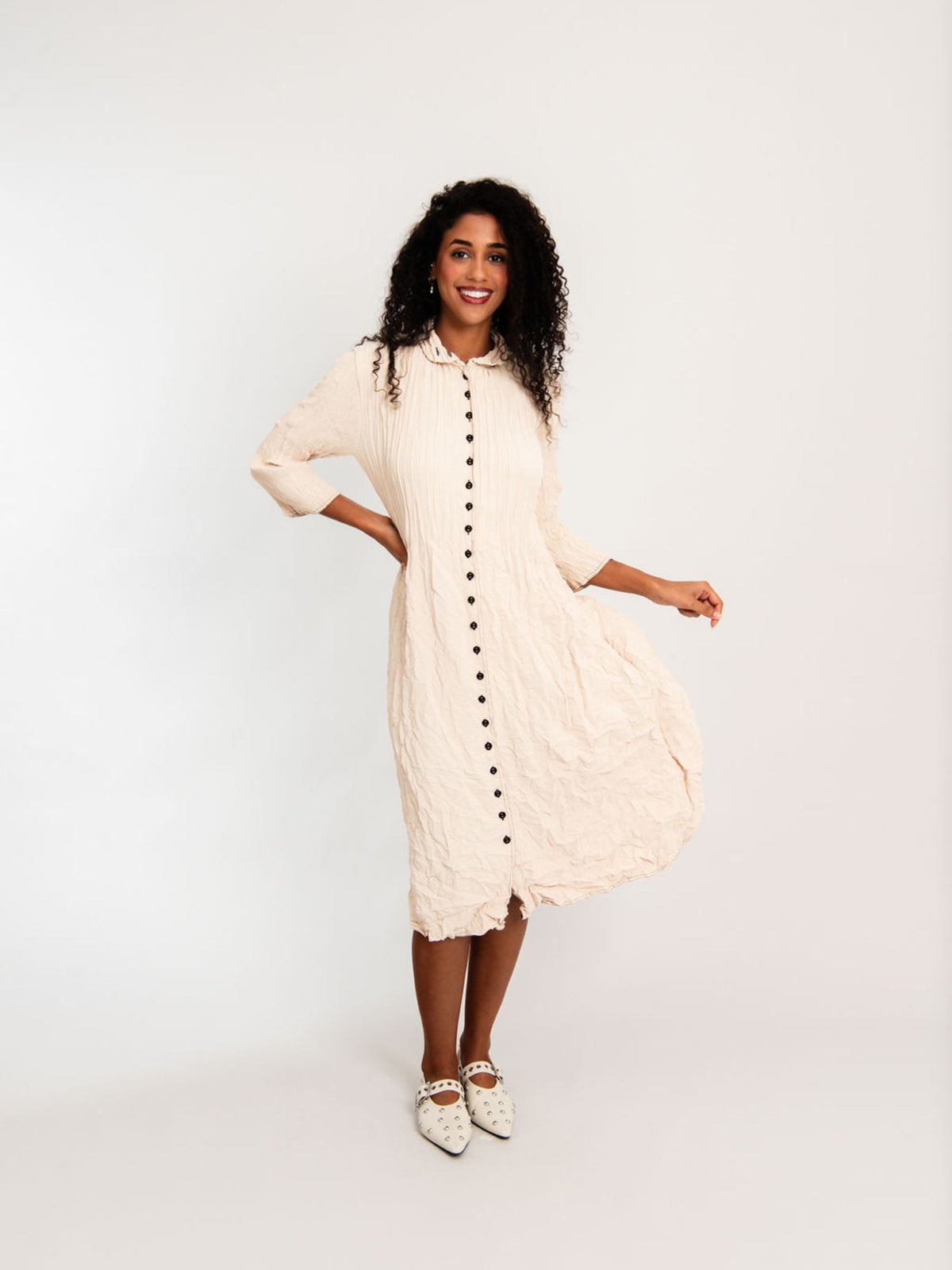 A new spin on a favourite, our Contrast Nehru Coat Dress is subtle and fun. Keeping to our beloved smash pleating with the contrasting detail of the stitching along the seams and punctuated with the white buttons. This versatile piece will take you seamlessly from day to night for any occasion.