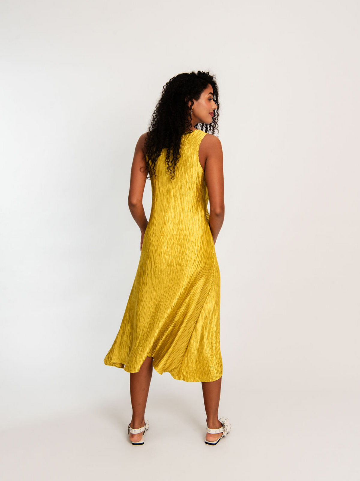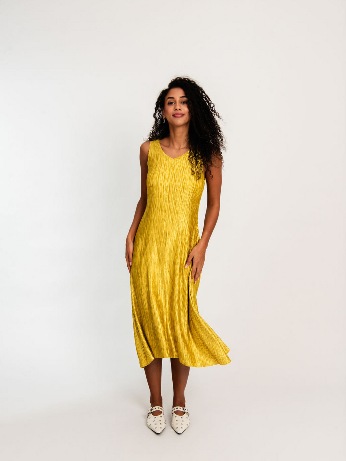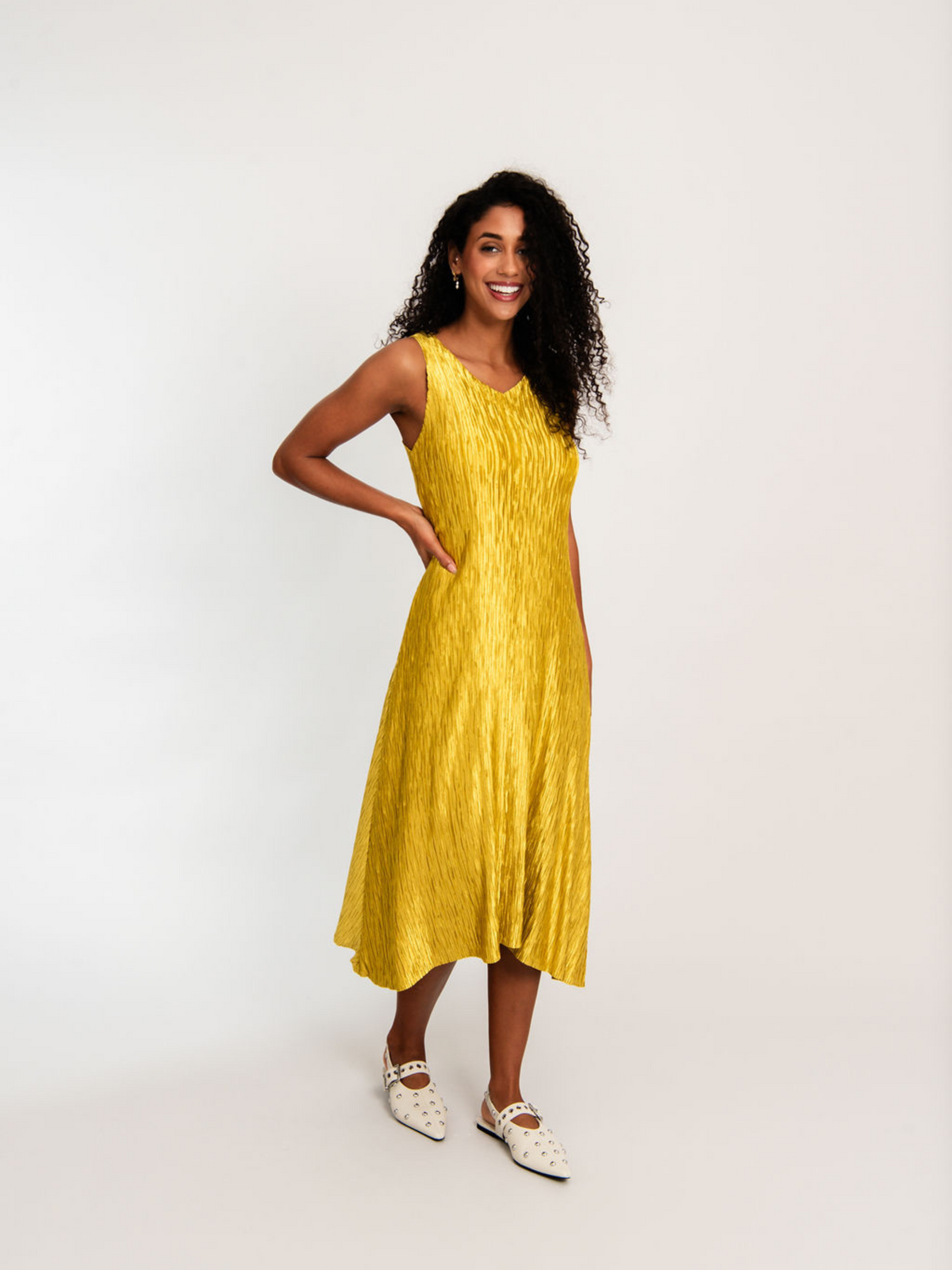 Luminous and sculptural, the Cosa Dress is a celebration of form, light, and texture. Crafted from 100% Satin Stretch with a radiant metallic finish, this sleeveless silhouette features a V-neckline and a softly flared skirt that moves with ease. Hand pleated using Alquema’s unique crushed technique, the fabric captures and reflects light with every step, creating a sense of depth and dimension. Flared at the waist for a flattering shape, the Cosa Dress embodies individuality and fluid sophistication.