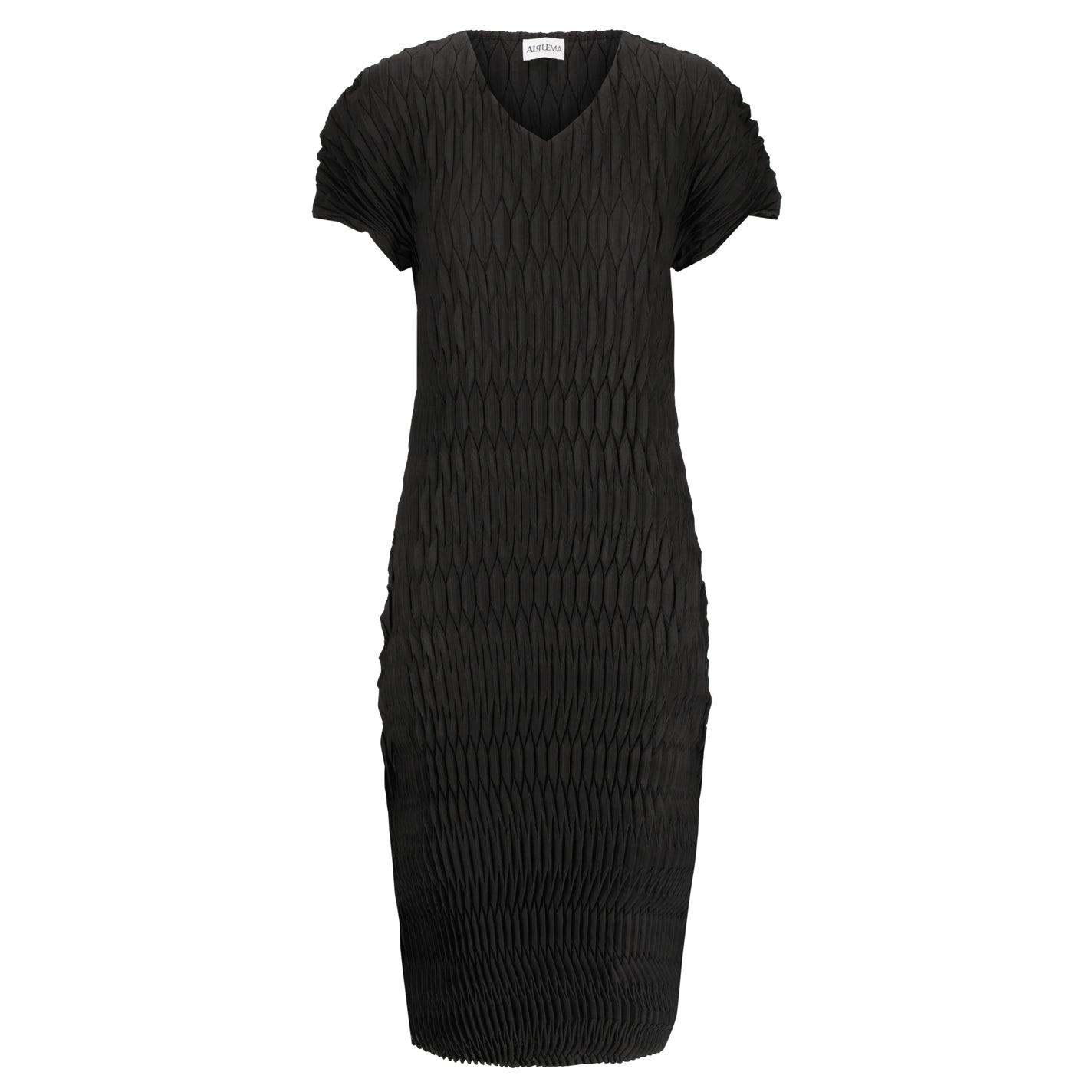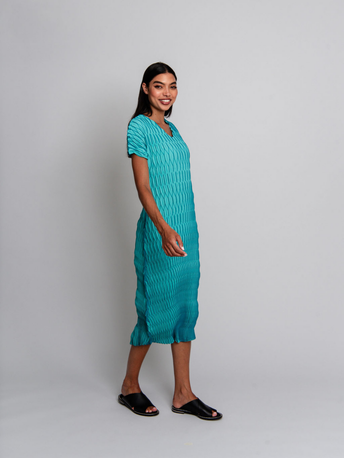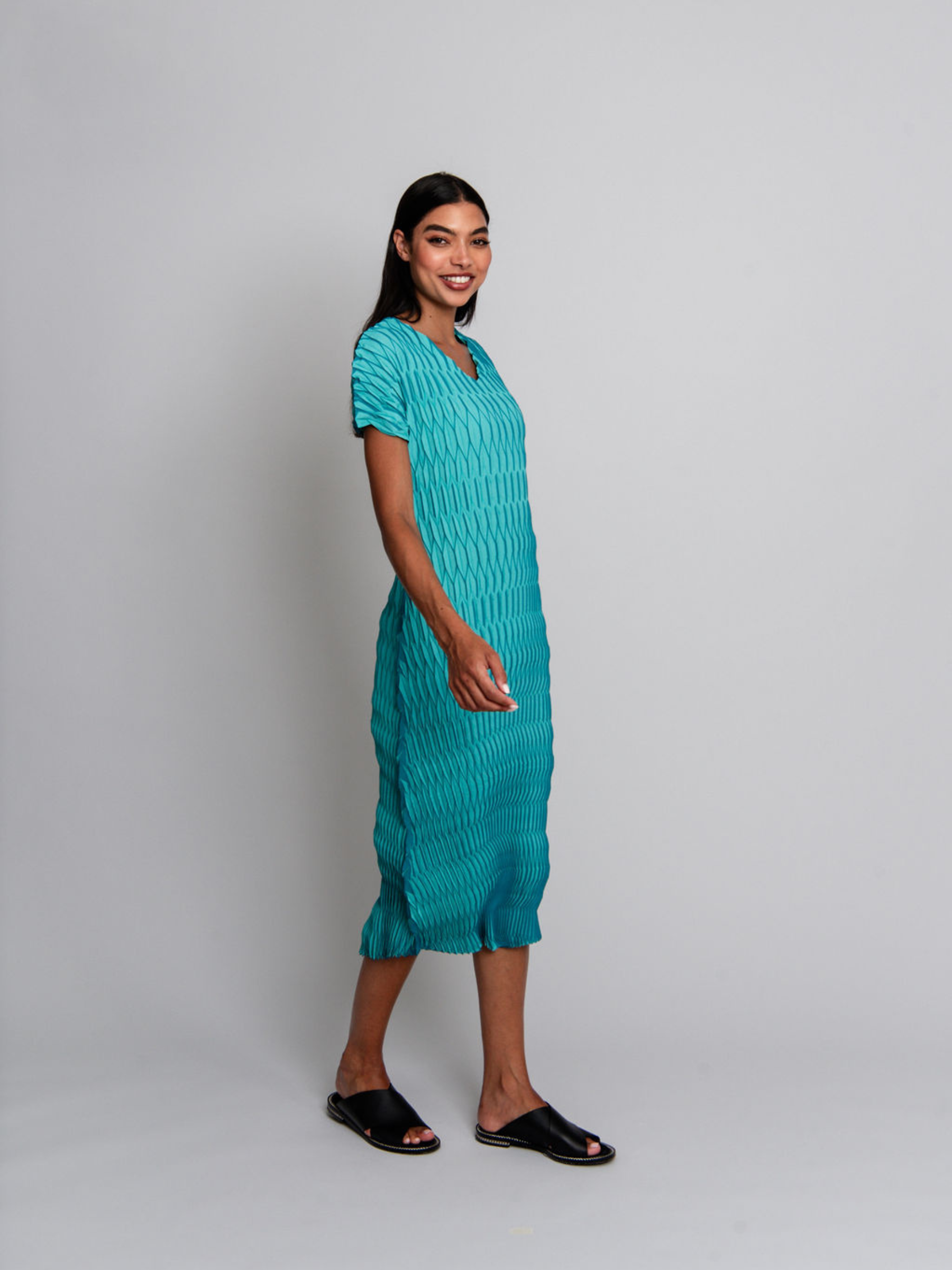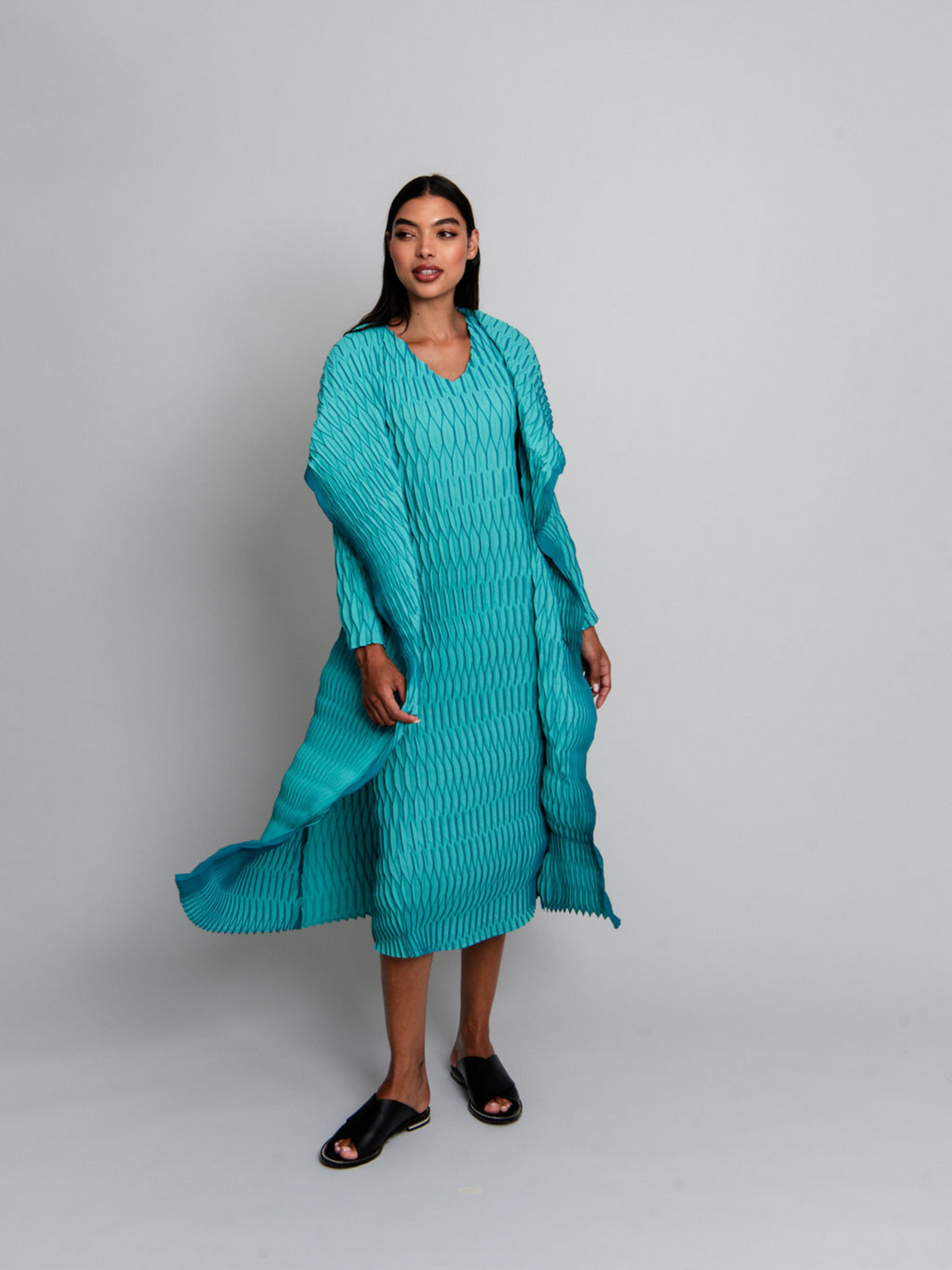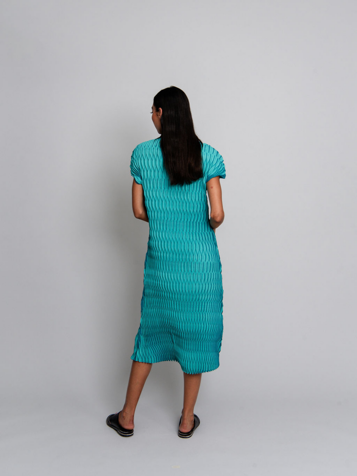 The Lantern Dress is a flowing expression of modern style. Handcrafted with geometric pleats, its full-length silhouette drapes effortlessly, while the high V-neck and short sleeves offer timeless sophistication. Perfect for desk to dinner styling, this piece pairs seamlessly with the coordinating Lantern Coat.