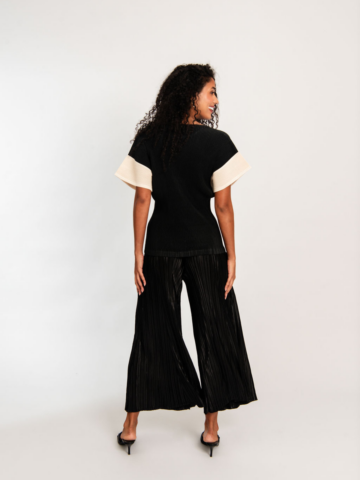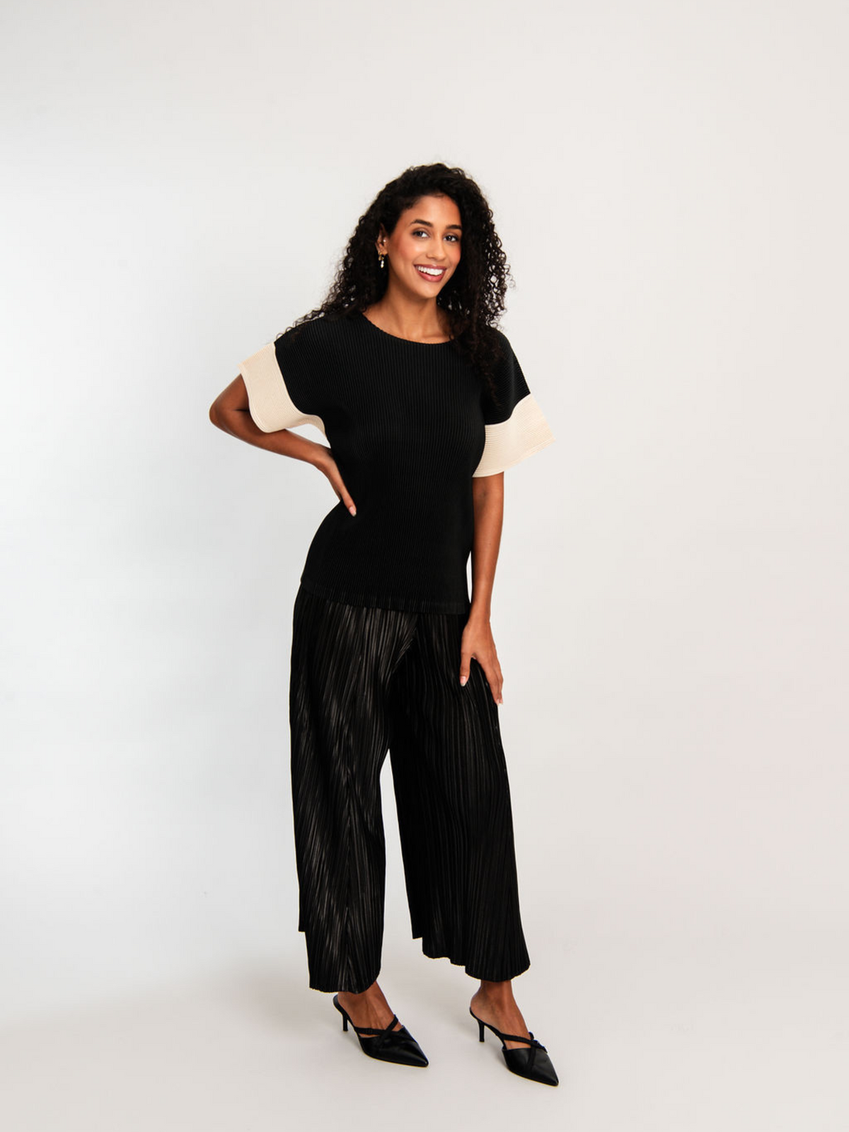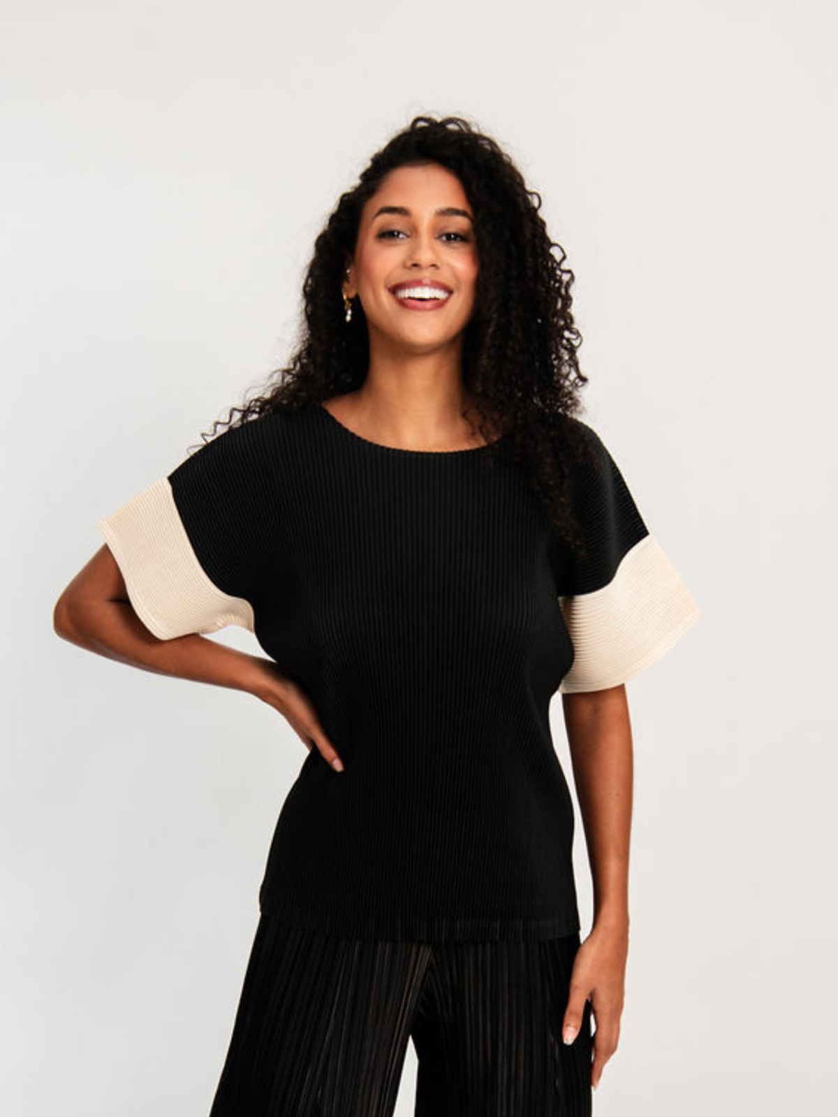 An elevated take on the everyday tee, the Manica Tee pairs refined design with textural depth. Crafted from 100% Fine Plissé, this piece offers a delicate yet structured feel with a gentle stretch that contours and moves with the body. The high neckline and softly flared short sleeves bring a sculptural quality, while the contrast cream detailing on the sleeves adds a modern point of interest. The Manica Tee is a timeless essential designed to be worn on repeat.