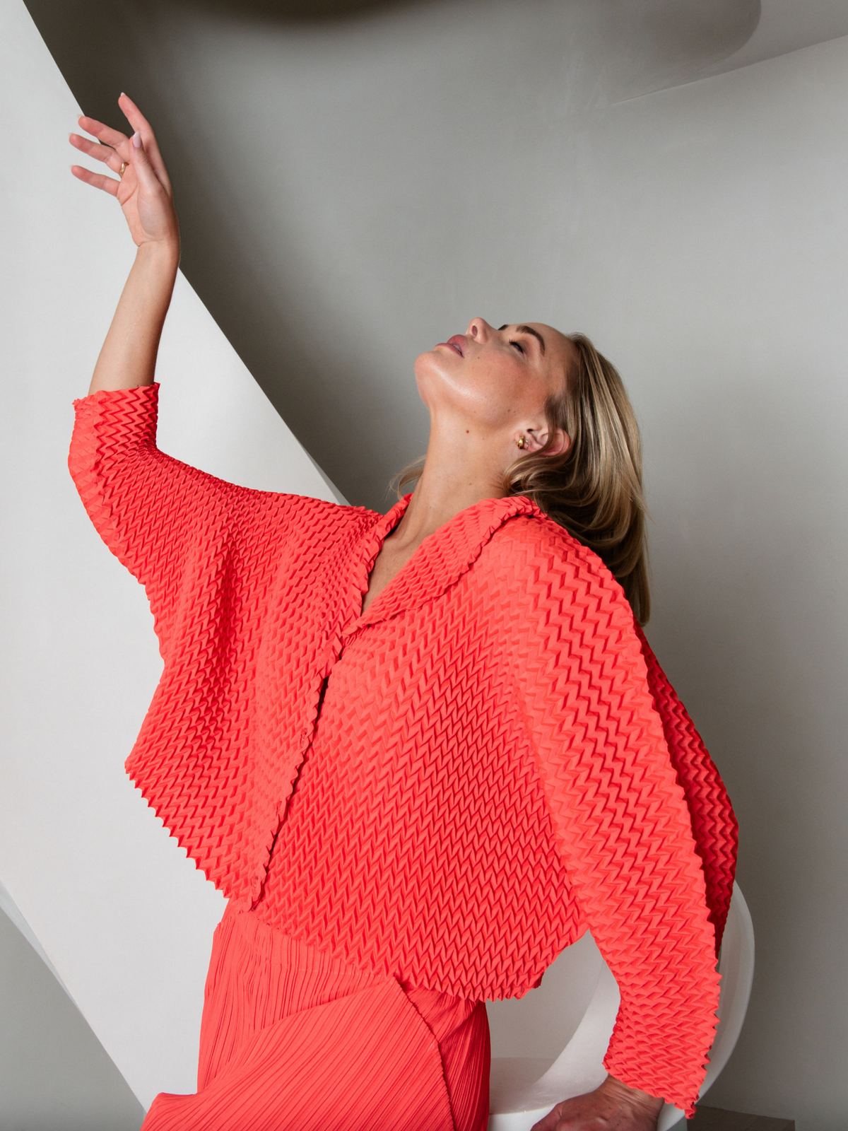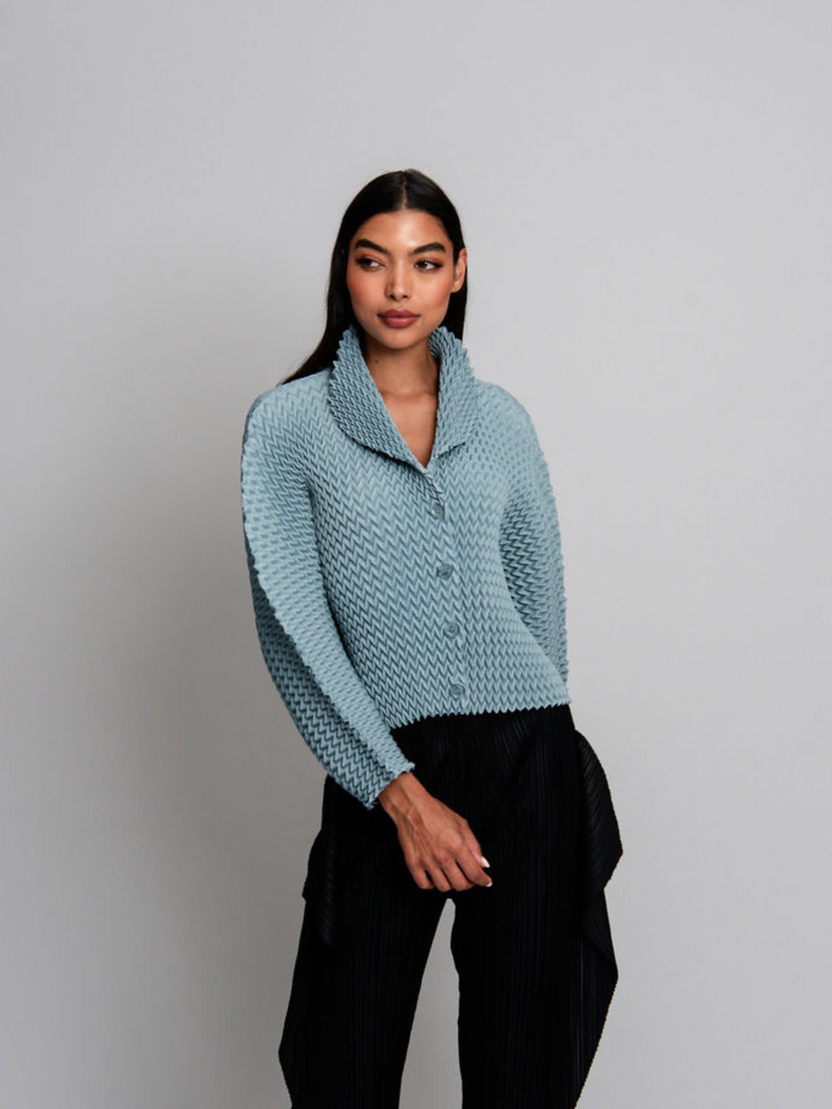 A beautiful hand pleated bolero adds shape and form to any outfit. The collar beautifully frames the face.
