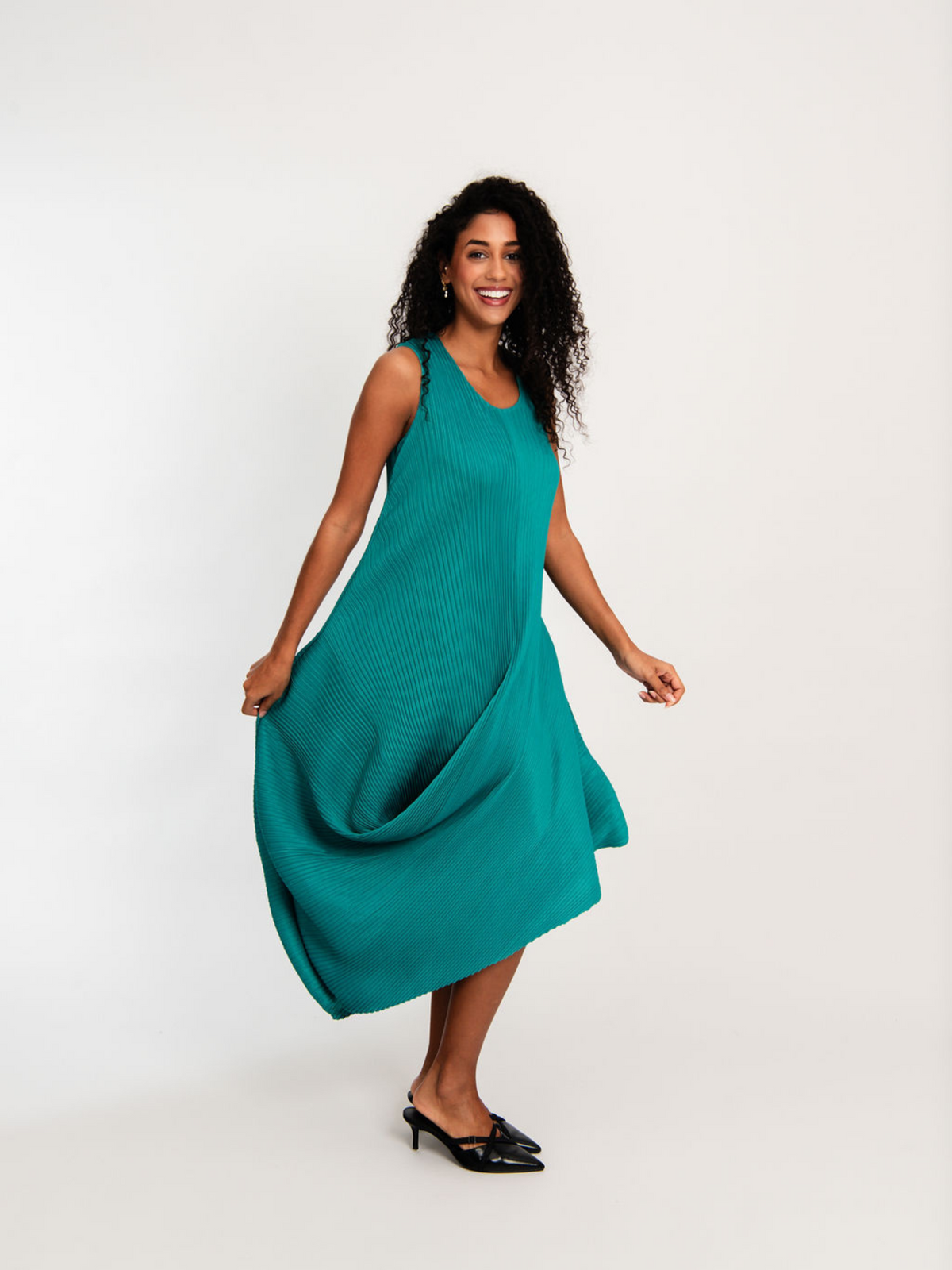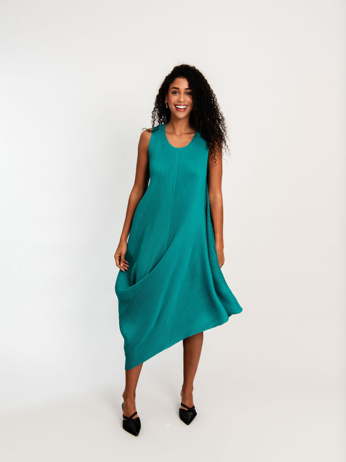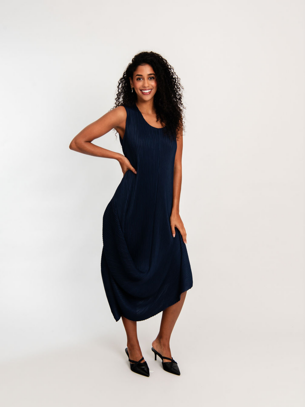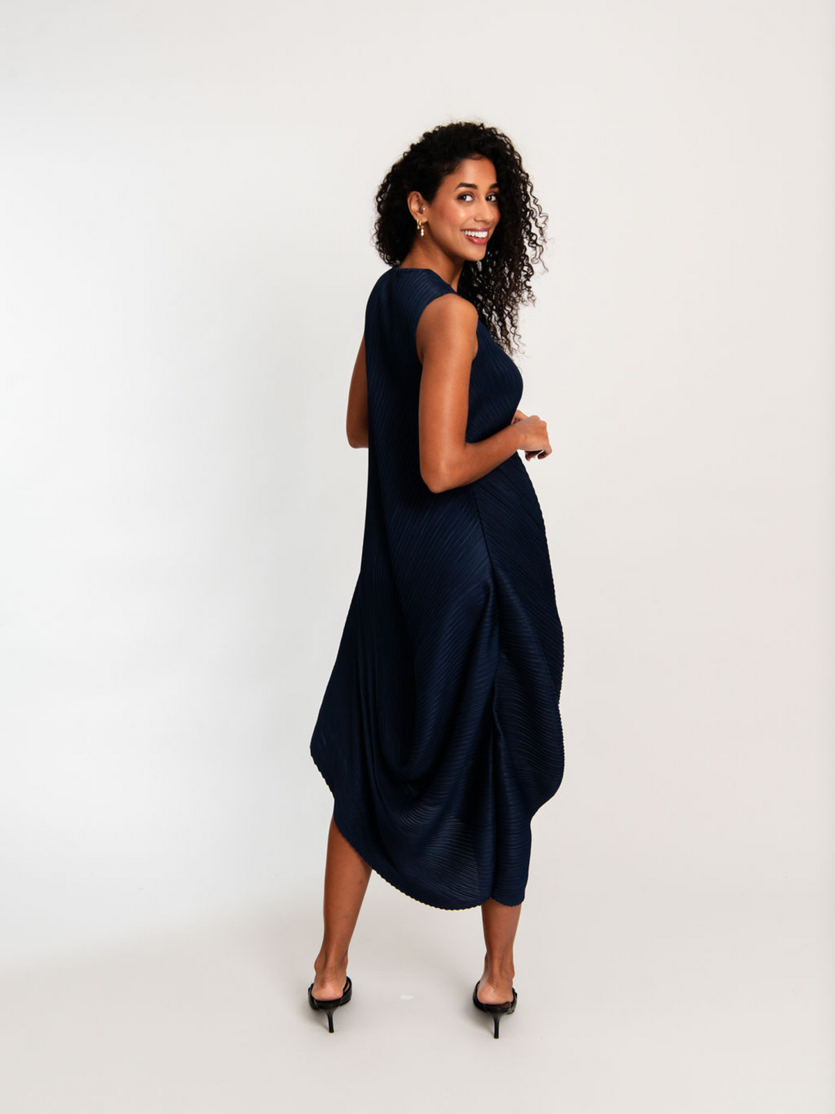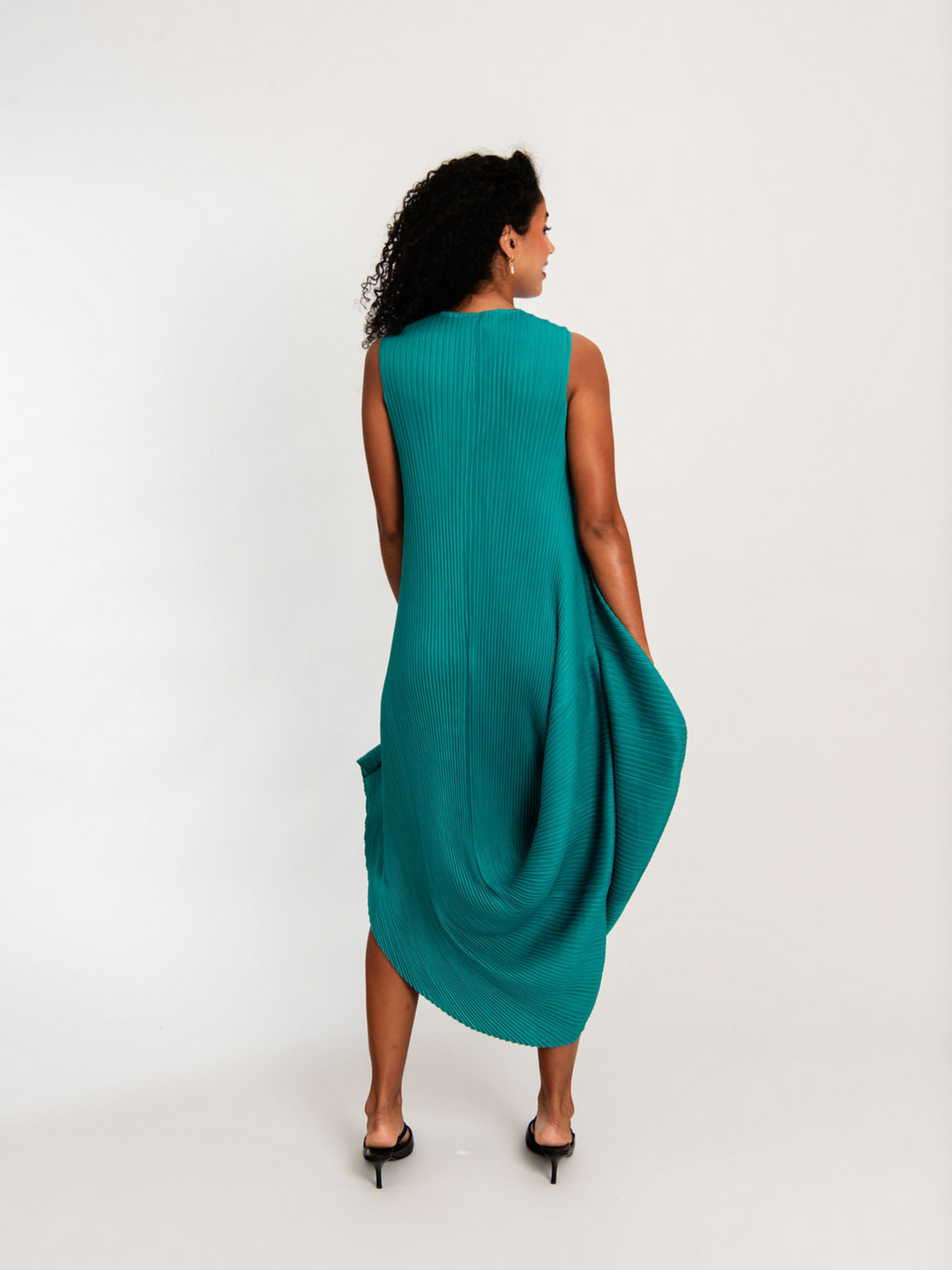 Bold in form and rich in texture, the Sleeveless Draper Dress is a tribute to fluid architecture and expressive design. Crafted in 100% High Temp using Alquema’s unique pleating technique, this structural silhouette features a round neckline and sculptural draping that cascades into a dynamic, asymmetrical hem. Sleeveless and form-conscious, it moves with intention and creativity.