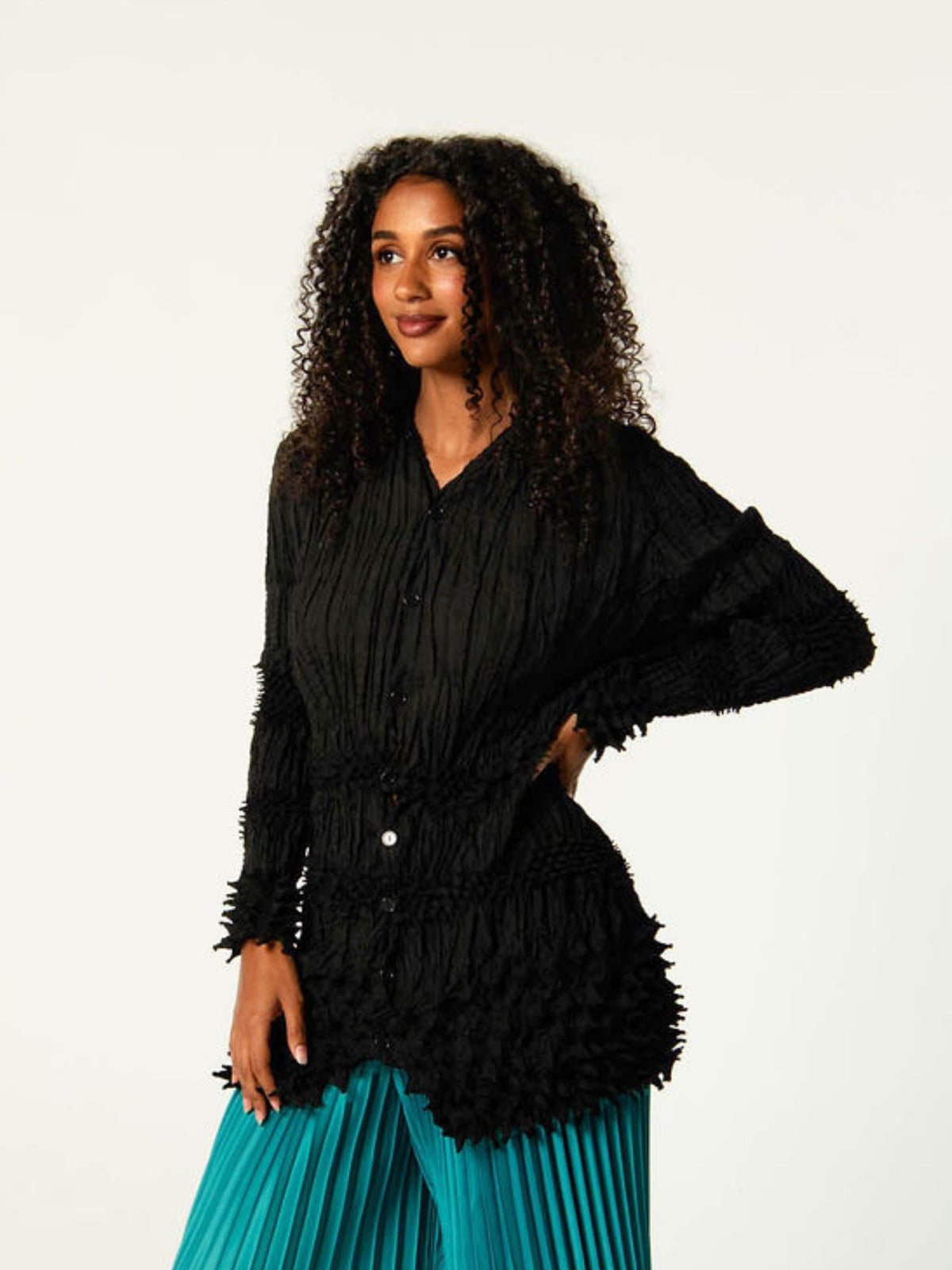 A celebration of texture and technique, the Urchin Top returns to the foundations of Alquema’s design language. Defined by sculptural shibori work and tactile surface texture, this long sleeve style balances structure with style. Soft volume through the body is contrasted with richly textured panels, creating a dimensional silhouette that feels considered from every angle. Finished with a button-through front, it can be worn as a top or styled open as a lightweight layer.